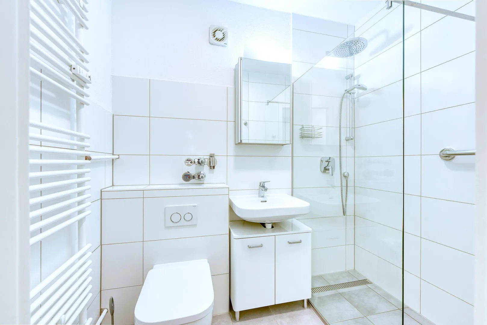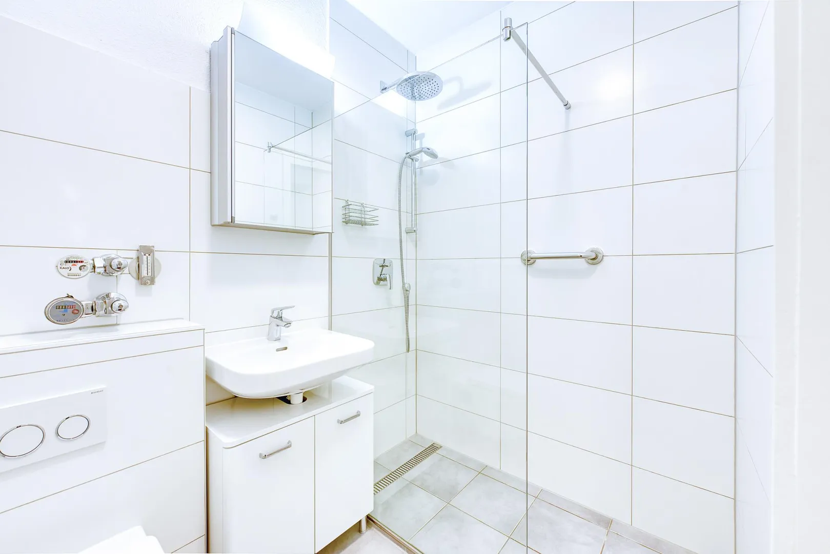 Das 2/3-hoch geflieste Badezimmer ist ausgestattet mit einer bodentiefen Rainbow-Dusche, einem WC, einem Handtuch-Heizkörper, einem belichteten Spiegel-Schrank sowie einem Waschtisch-Unterschrank.