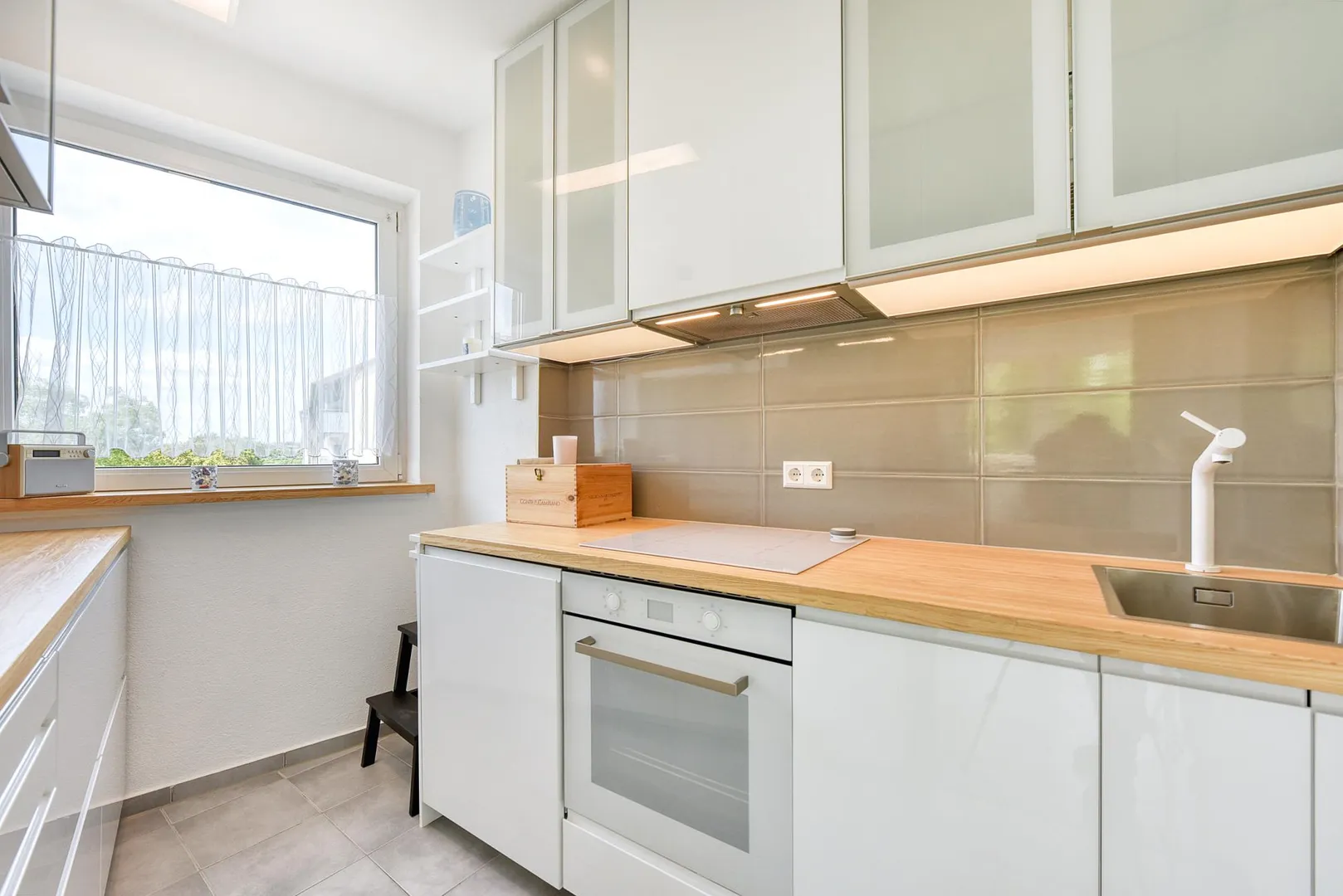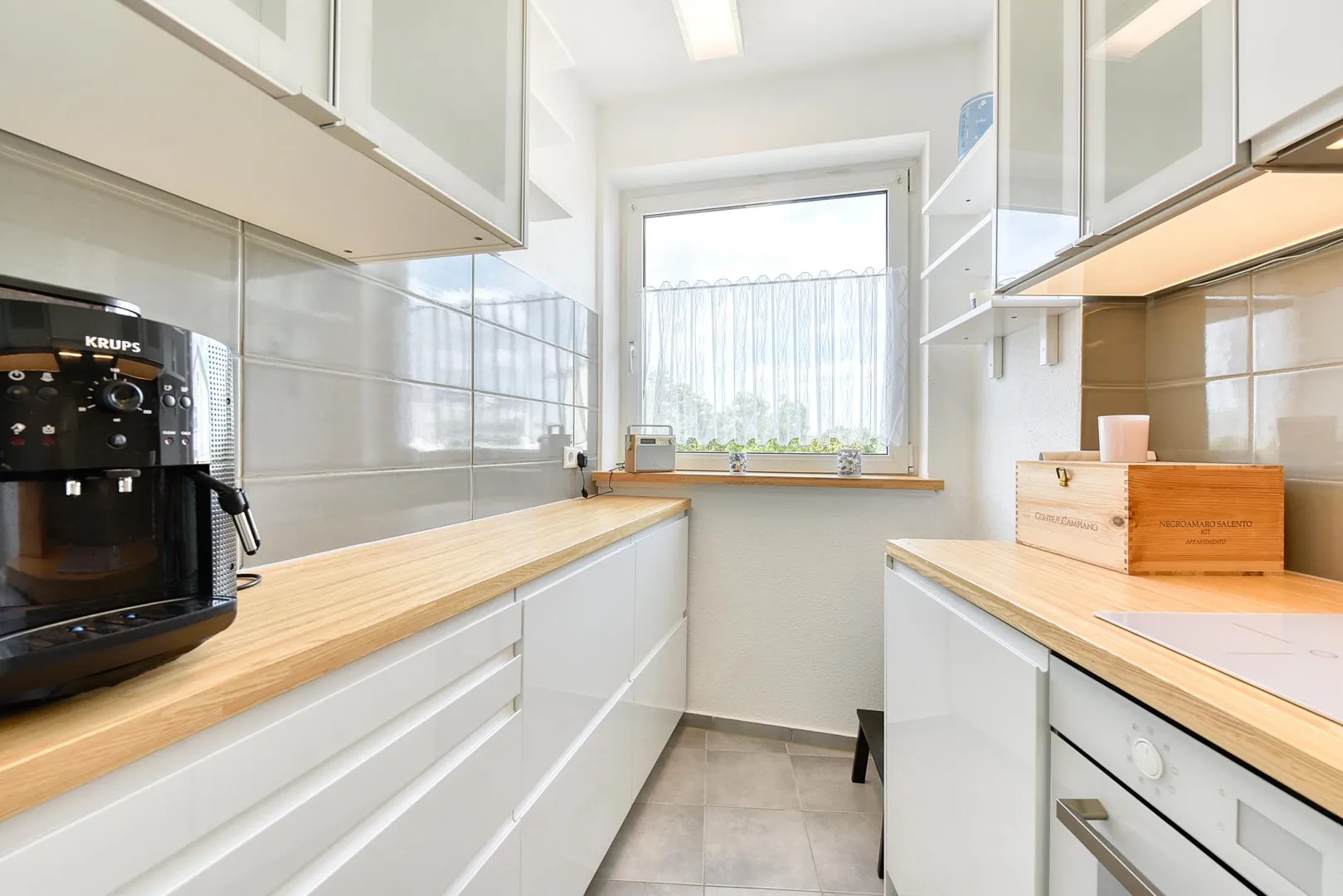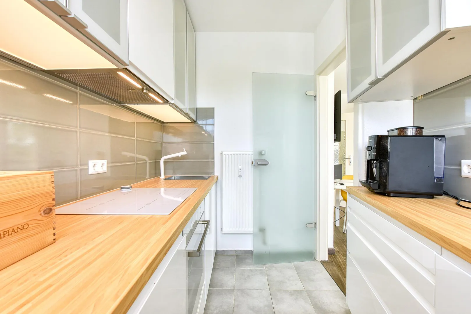 Die Küche ist ausgestattet mit einer Milchglas-Tür sowie einer hochwertigen Einbauküche mit Induktionskochfeld.