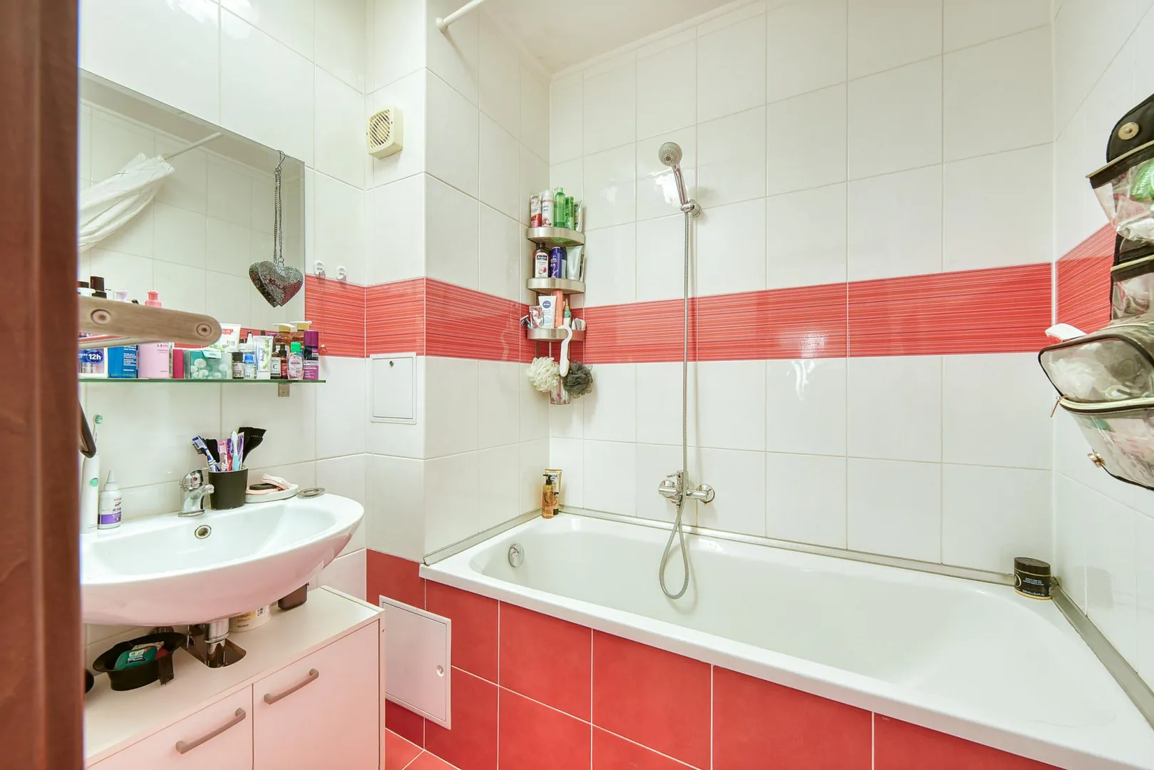 Das raumhoch geflieste Badezimmer ist ausgestattet mit einer Badewanne sowie einem Handtuch-Heizkörper.