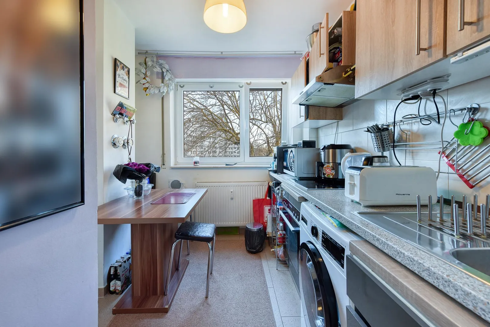 Die Küche ist ausgestattet mit einer Einbauküche sowie einem Waschmaschinen-Anschluss.