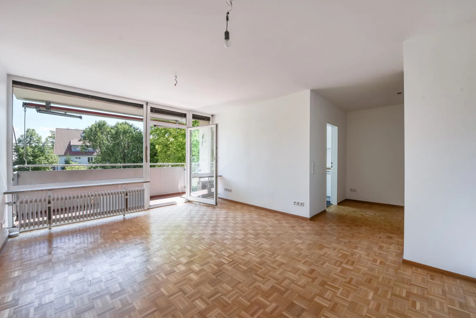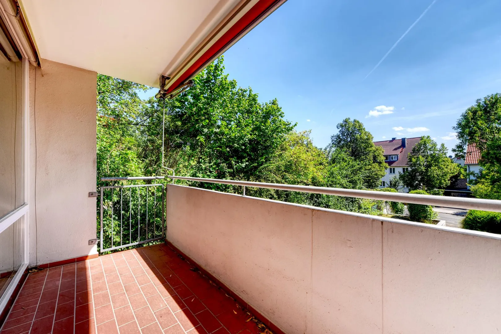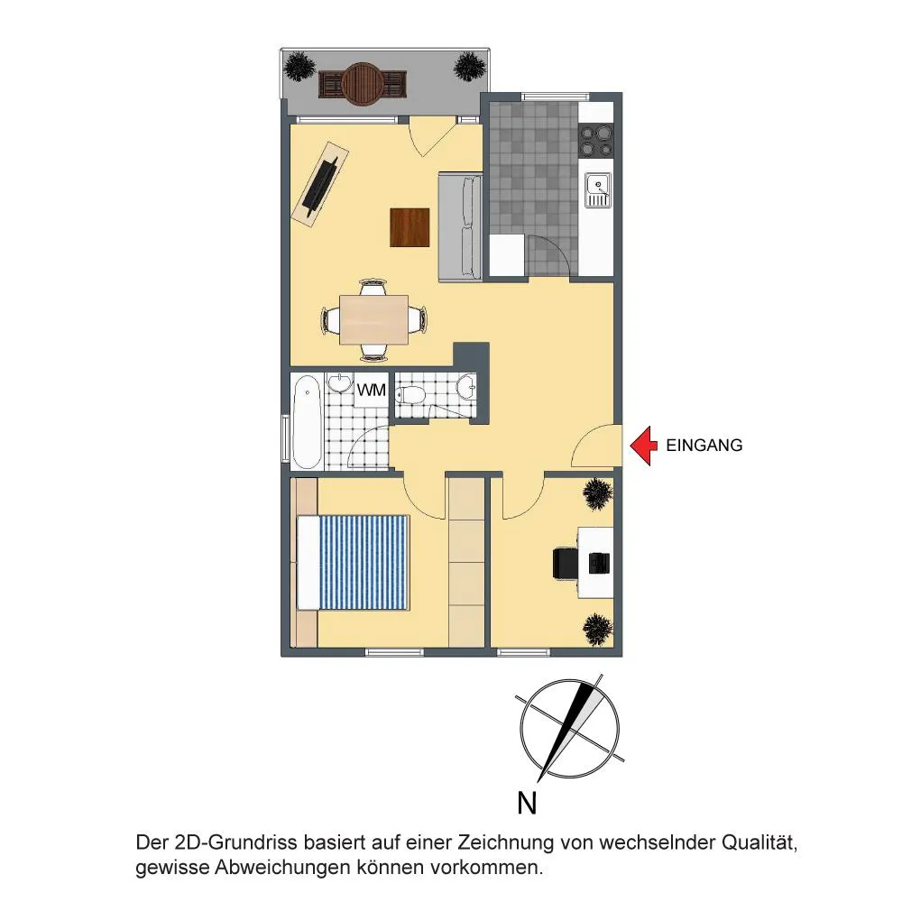 Der Grundriss ist gut. Alle Räume sind direkt vom Flur begehbar. Der Wohnbereich ist zum Flur offen. Das Badezimmer verfügt über ein Fenster. Das WC ist separat. Der ca. 6 m² große und überdachte SSO-Balkon mit Markise ist über den Wohnbereich begehbar.