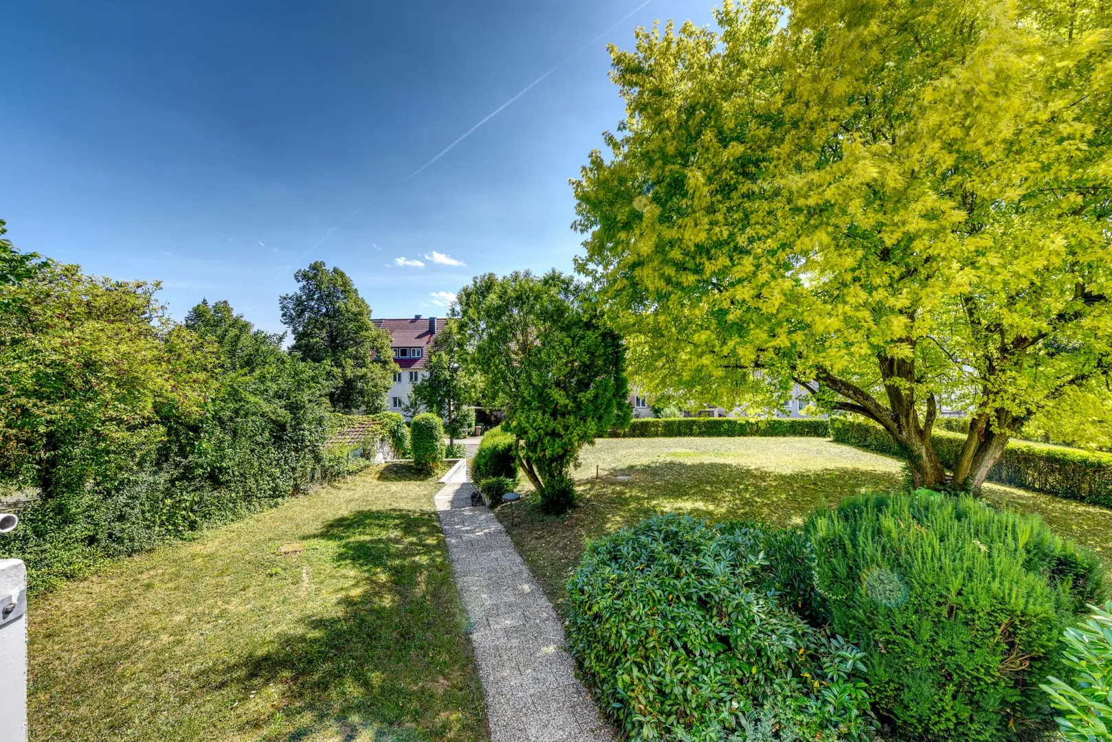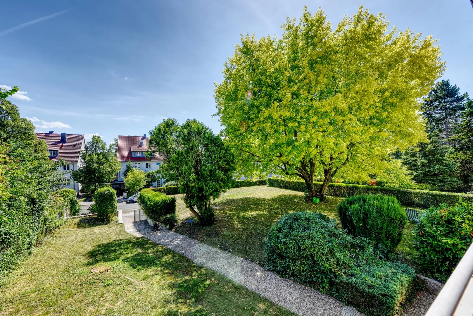 Das Wohnhaus befindet sich ca. 30 Meter von der Straße entfernt. Das Grundstück grenzt auf der Nordseite direkt an Gärten, diese wiederum an den Lemberg mit Weinbergen. Auf der Nordseite ist es grün, absolut ruhig und idyllisch.