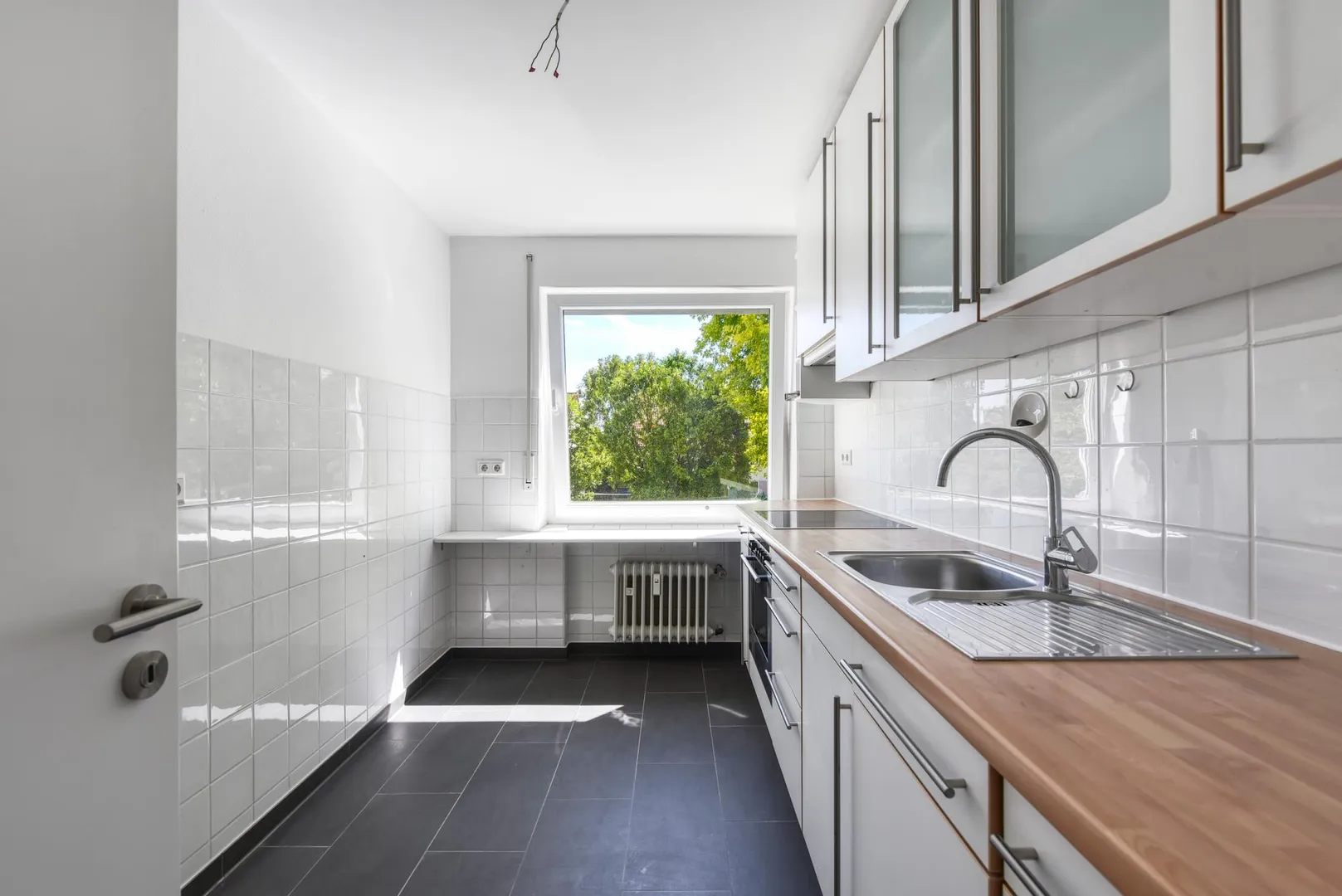 Die Wände sind mit Glasfasertapeten tapeziert und frisch, weiß gestrichen. Die Raumhöhen betragen ca. 2,44 Meter.