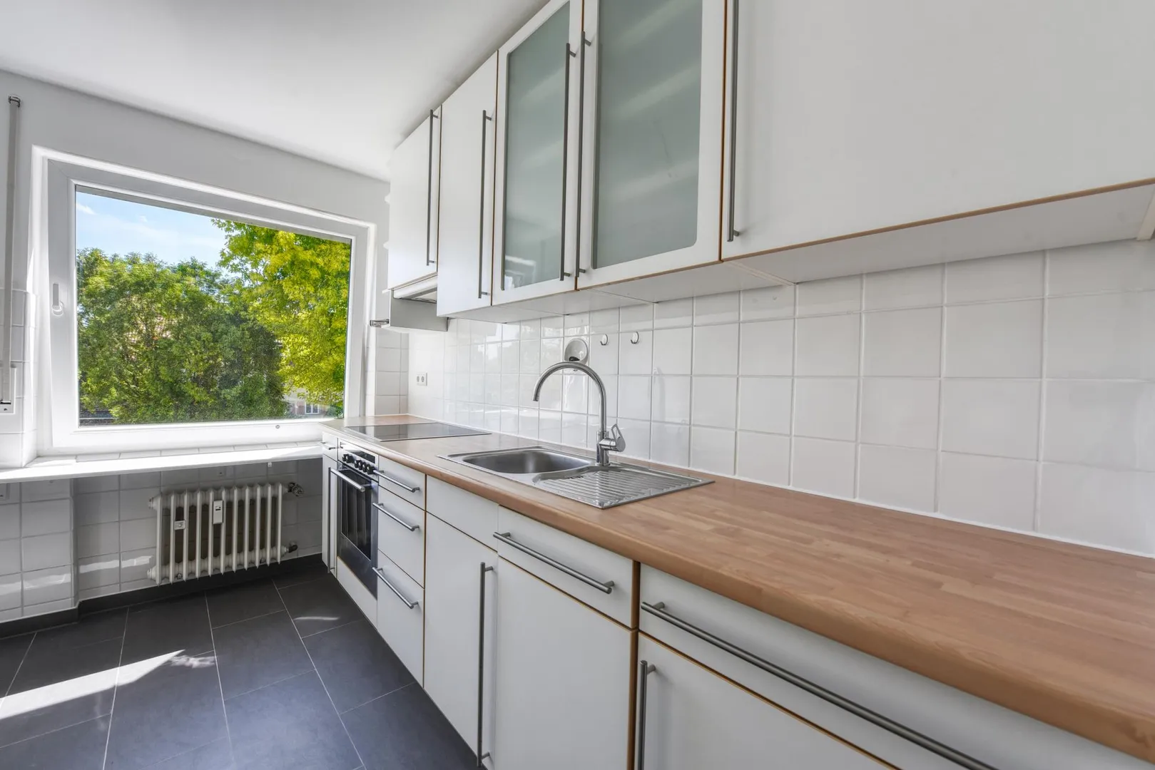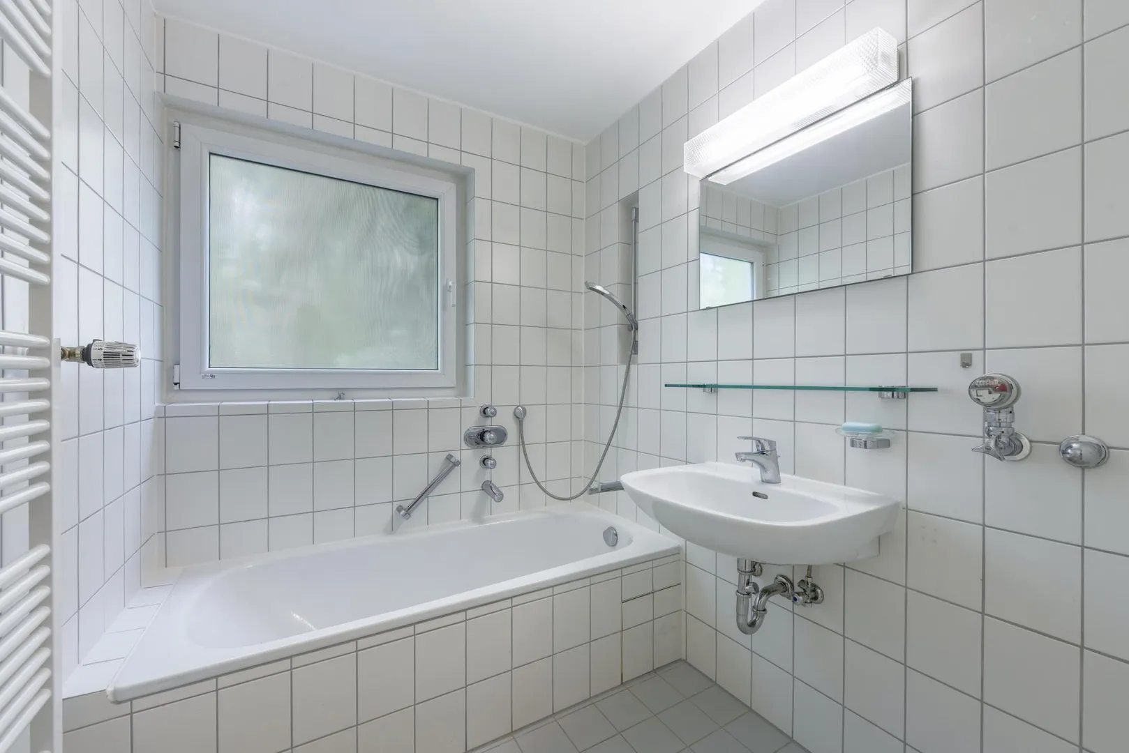 Das raumhoch geflieste Tageslicht-Bad wurde in den 90-er Jahren modernisiert und ist ausgestattet mit einer Badewanne, einem Handtuch-Heizkörper, einem Waschmaschinen-Anschluss sowie einem Spiegel mit Belichtung.