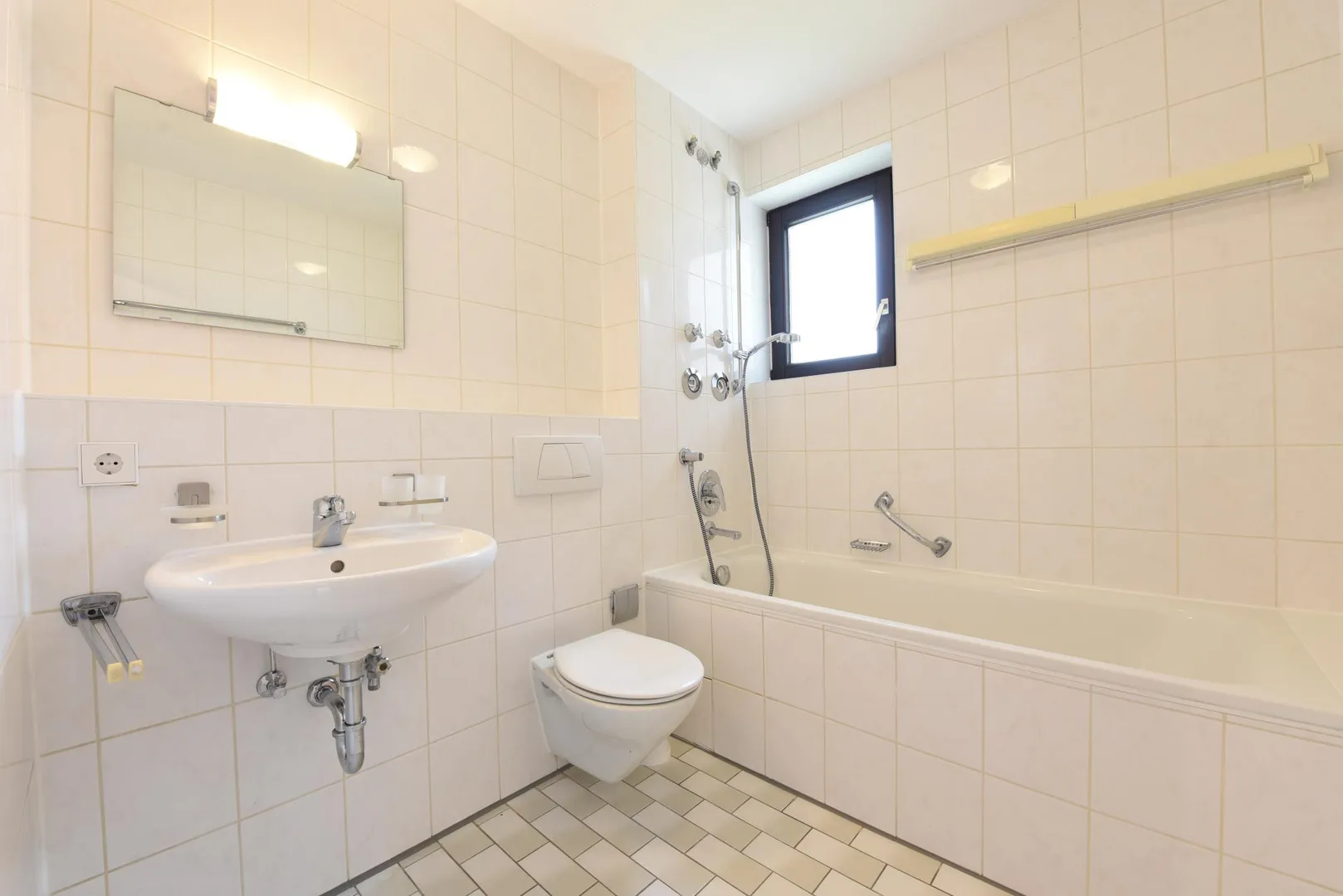 Das raumhoch geflieste Badezimmer mit Fenster ist ausgestattet mit einer Badewanne, einem WC sowie einem Handtuch-Heizkörper.