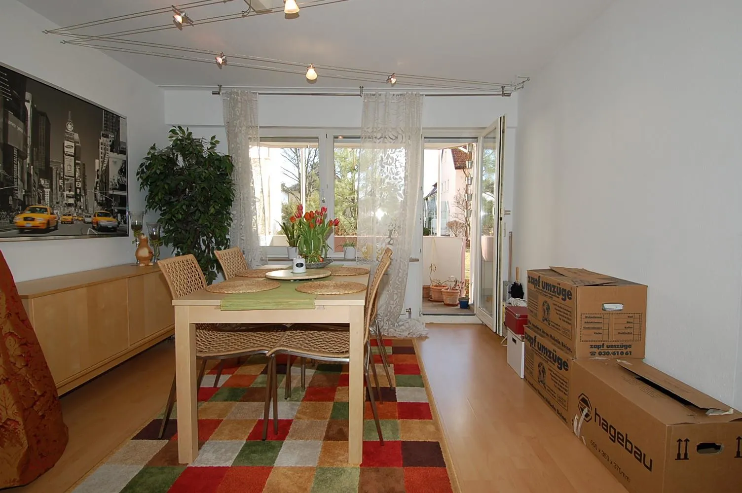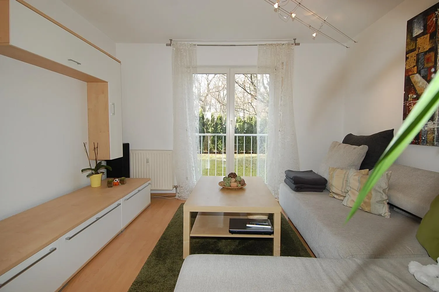 Das Wohn-Esszimmer verfügt über einen Süd-Balkon und einen französischen Balkon mit Blick ins Grüne.