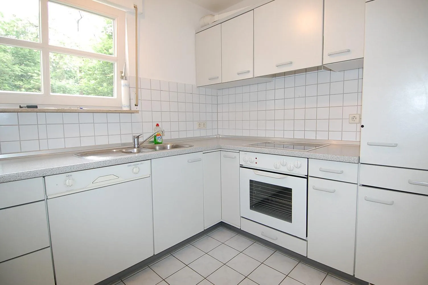 Die Küche ist gefliest und mit einer älteren Einbauküche mit E-Geräten ausgestattet.
