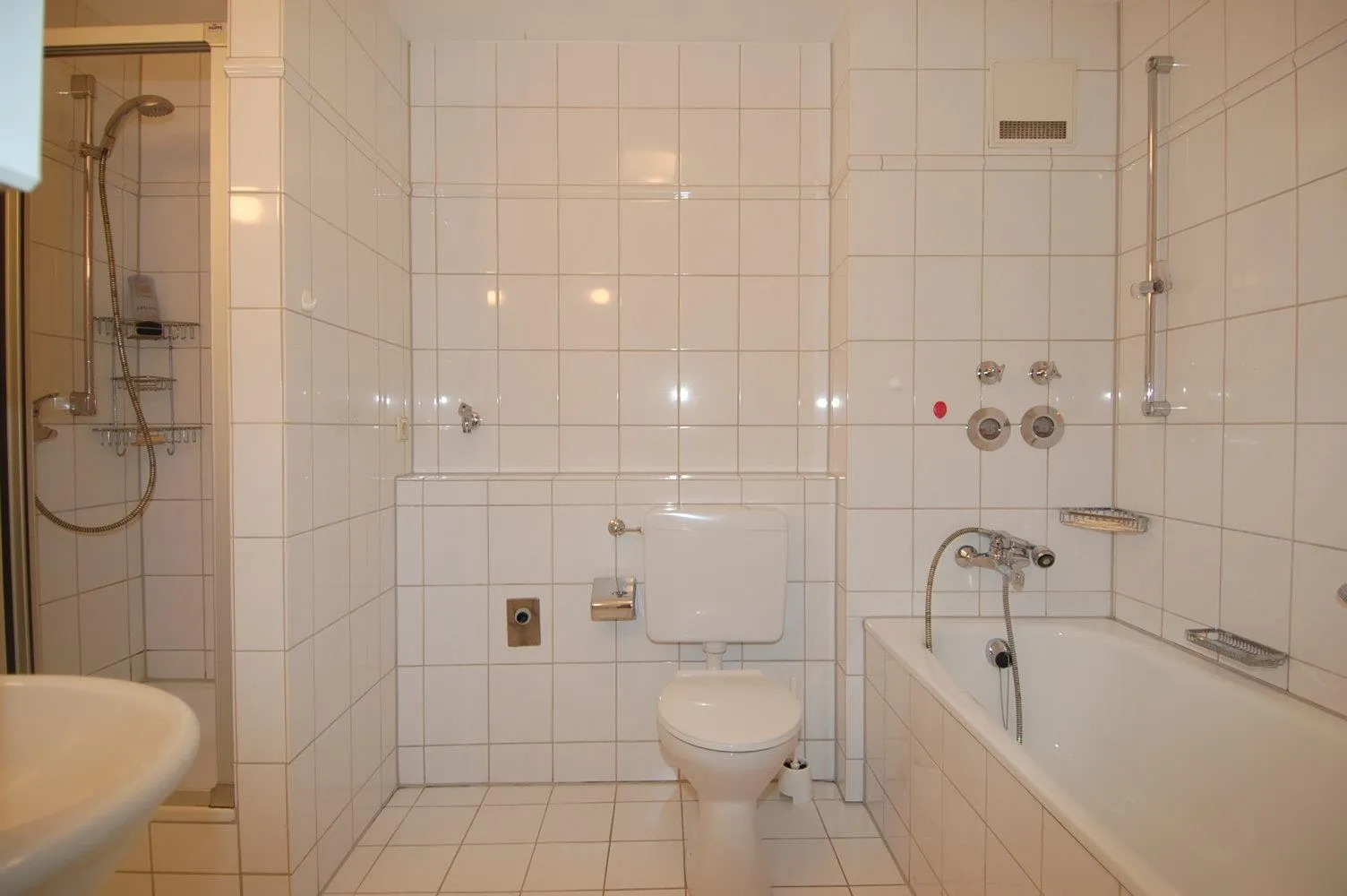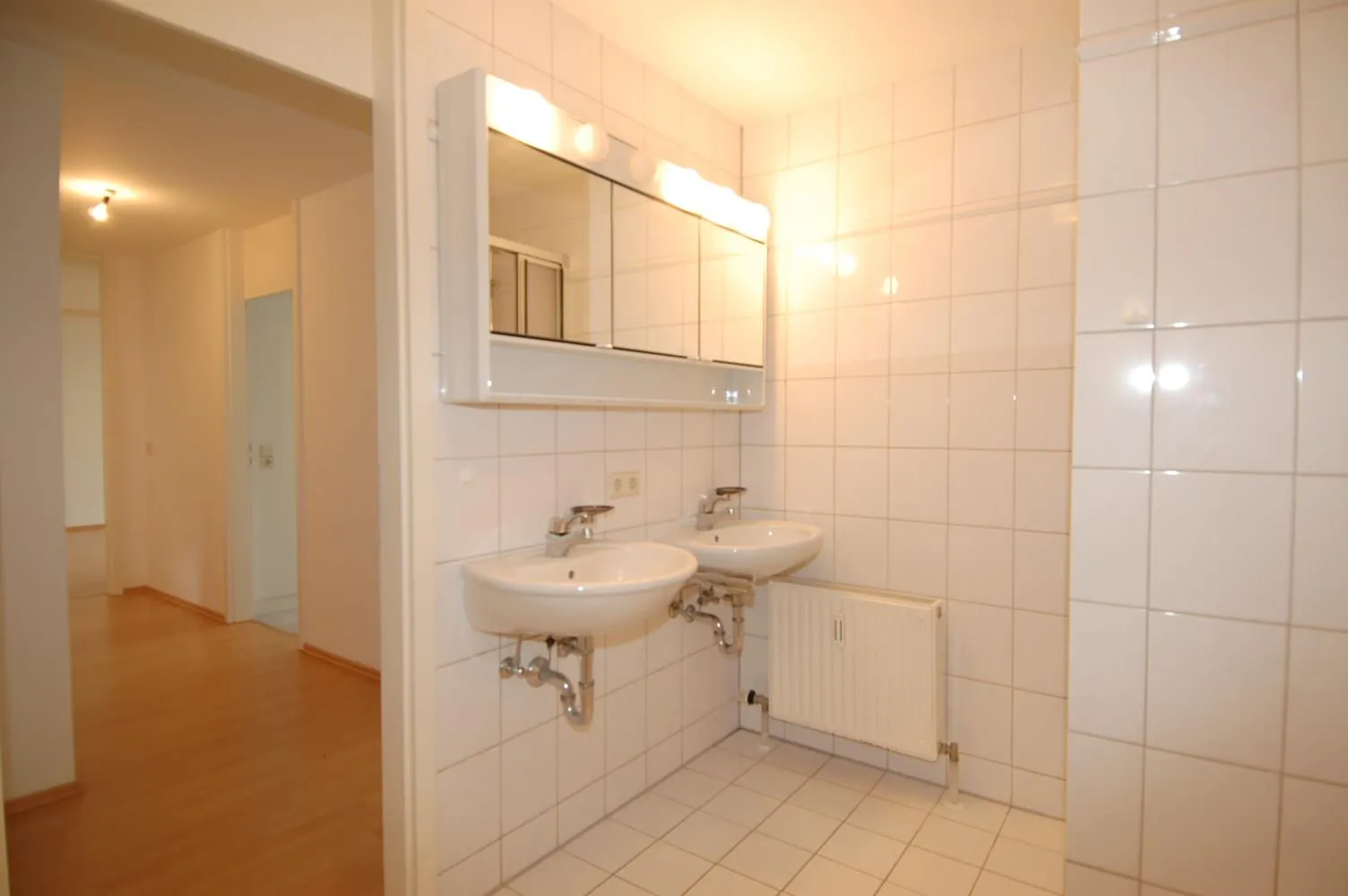 Das raumhoch geflieste Badezimmer ist ausgestattet mit einer Wanne, einer Dusche, zwei Waschbecken, einem Spiegelschrank, einem WC und einem Waschmaschinenanschluß.