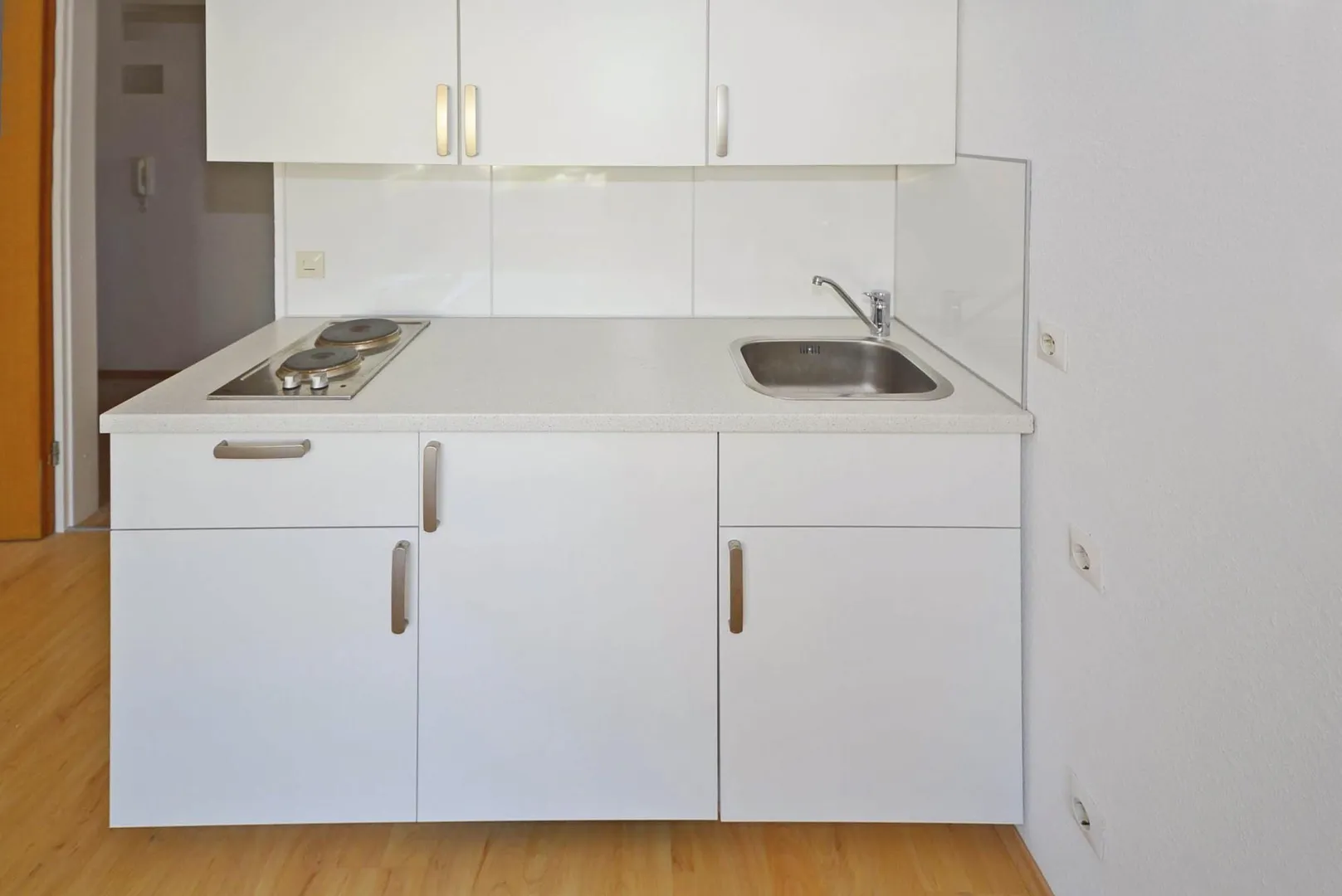 Das Zimmer ist ausgestattet mit einem Laminatboden sowie einer Küchenzeile. Die Küchenzeile verfügt über einen Kühlschrank mit Gefrierfach, 2 Kochplatten, eine Spüle sowie Unter- und Oberschränke. Die Elektrogeräte sind funktionsfähig. Für die künftige Funktionsfähigkeit der E-Geräte übernimmt der Vermieter keine Haftung. In der Küchenzeile sind keine Spülmaschine und kein Backofen vorhanden.