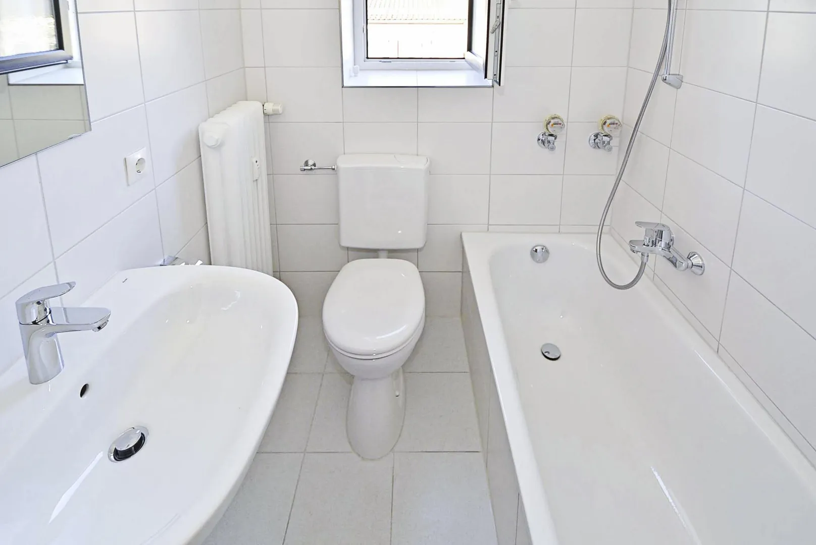 Das raumhoch geflieste Badezimmer wurde 2015 modernisiert und ist ausgestattet mit einem Fenster, einem Fliesenboden, einer Badewanne, einem WC sowie einem Spiegel.