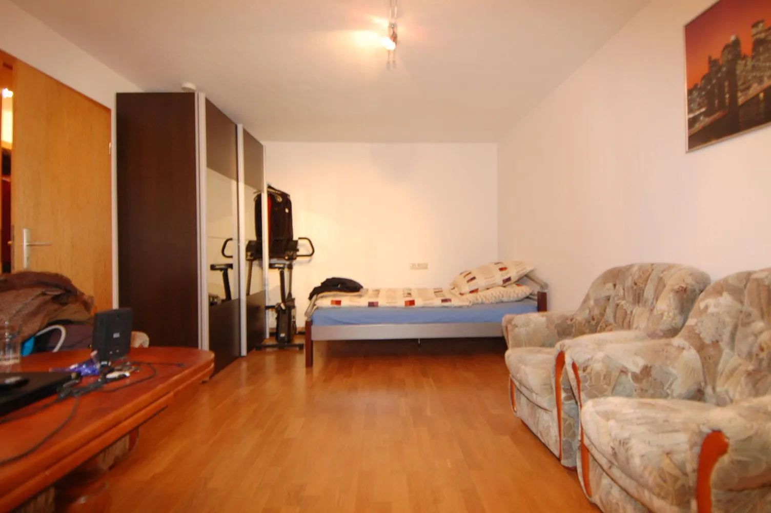 Das Wohn-/Schlafzimmer, die Küche und der Flur sind mit einem Parkettboden ausgestattet.
