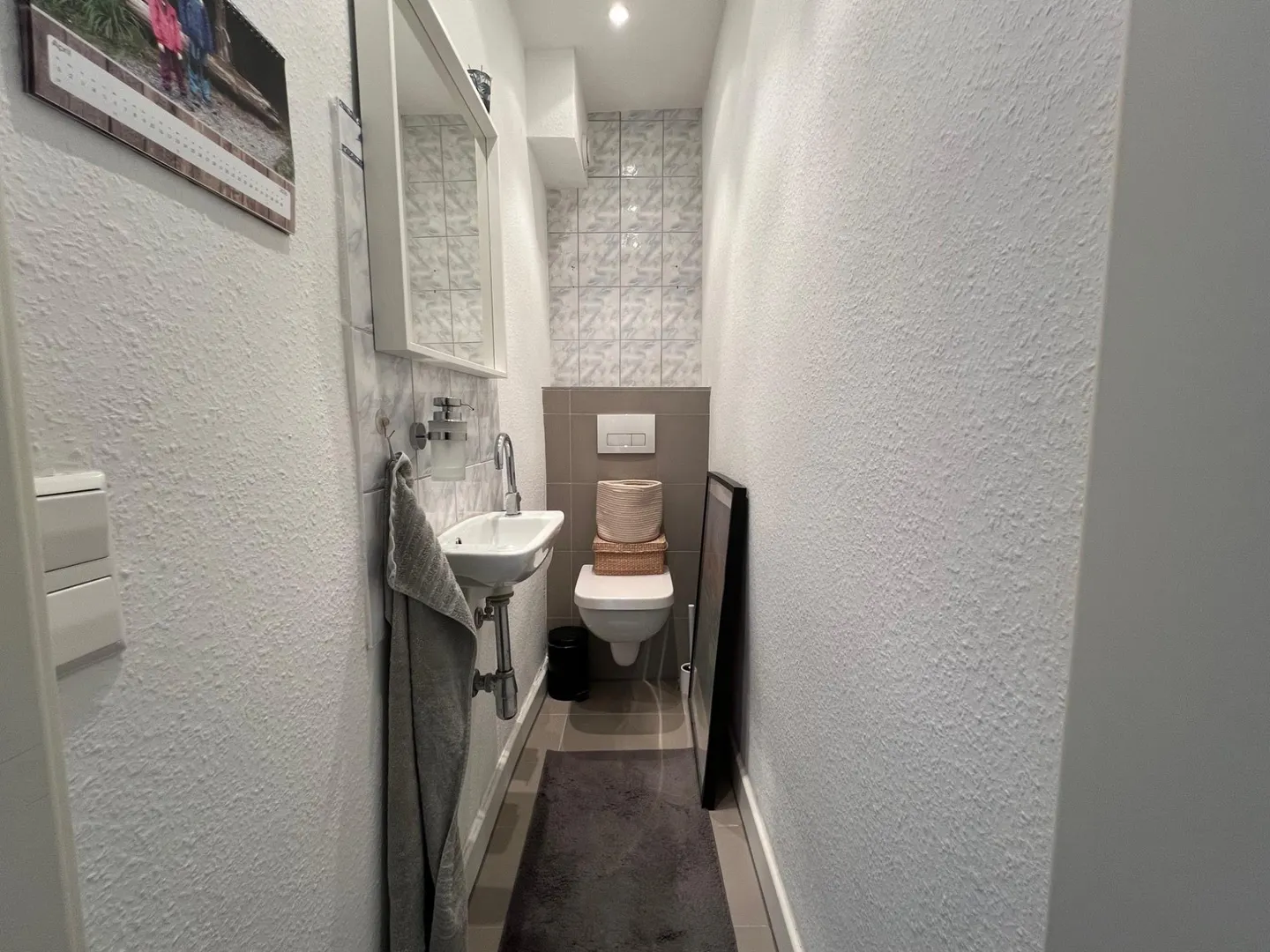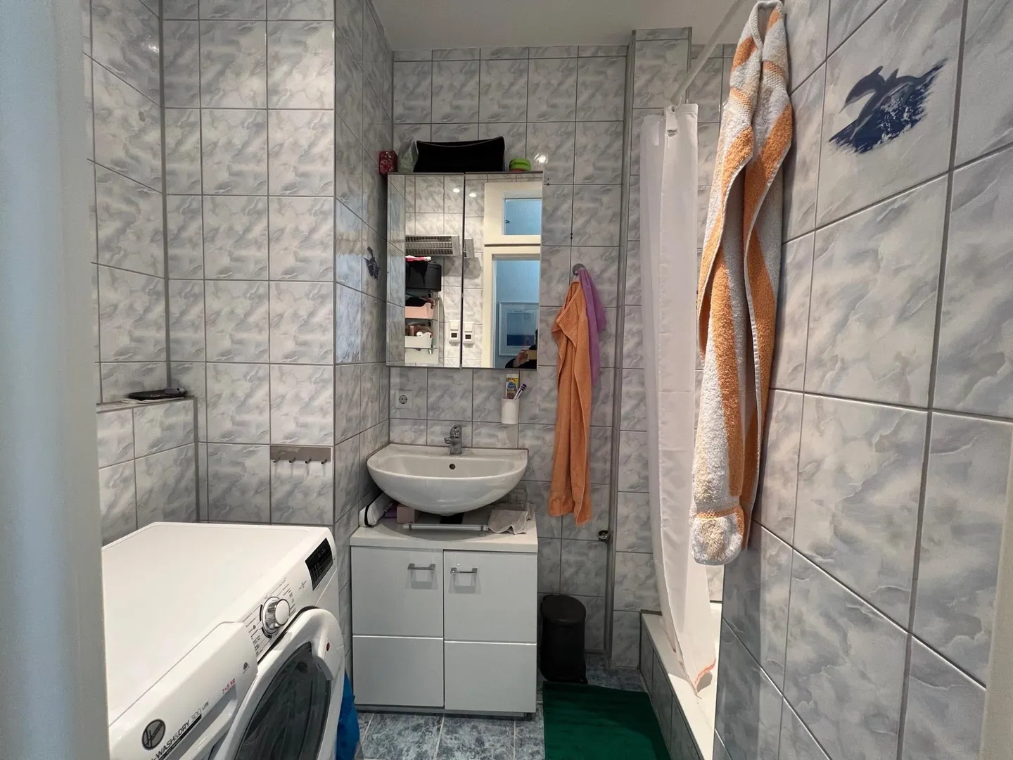 Das raumhoch geflieste Badezimmer ist ausgestattet mit einer Fußboden-Heizung, einer Dusche, einem Spiegelschrank sowie einem Waschmaschinen-Anschluss. Das geflieste WC ist separat.