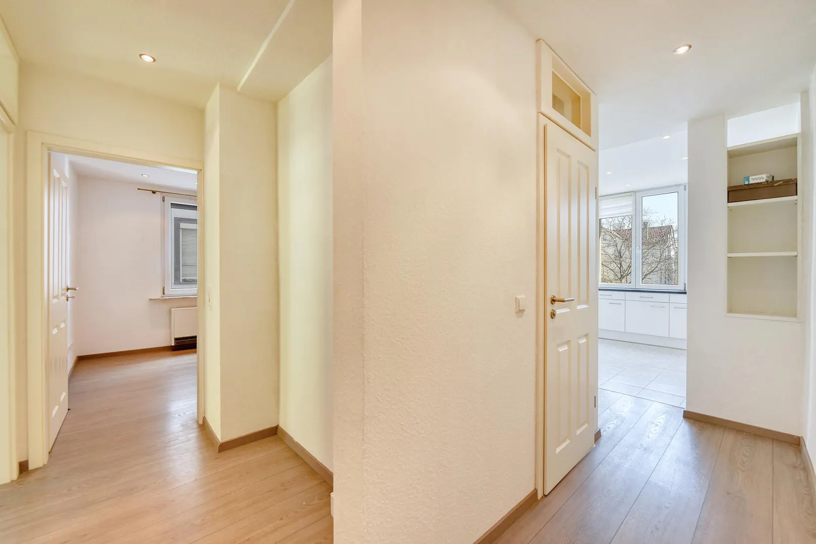 In den Zimmern und im Flur ist Laminat verlegt. Die Böden in der Küche, im Bad und im WC sind gefliest.