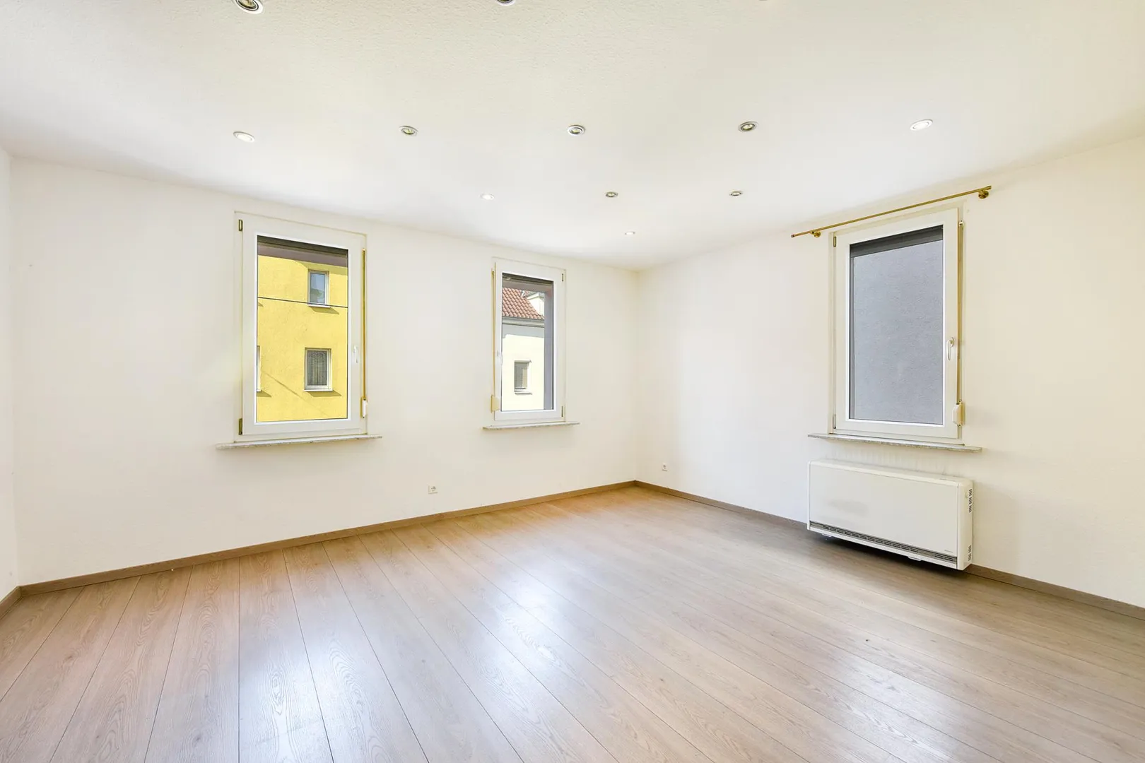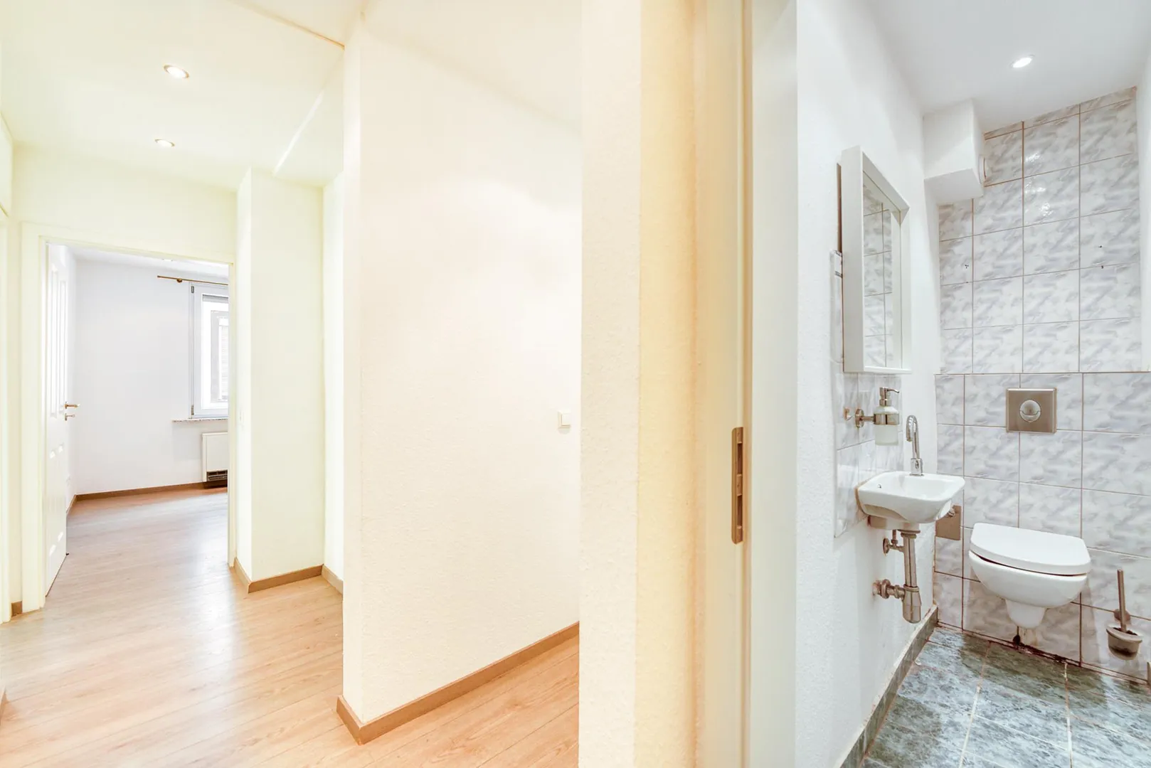 In den Zimmern und im Flur ist Laminat verlegt. Die Böden in der Küche, im Bad und im WC sind gefliest.