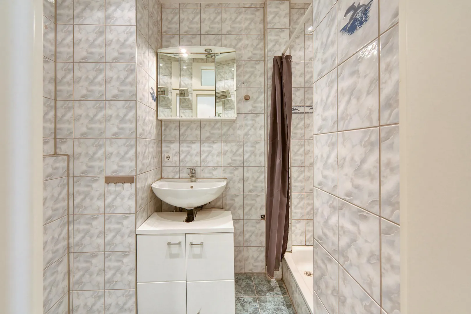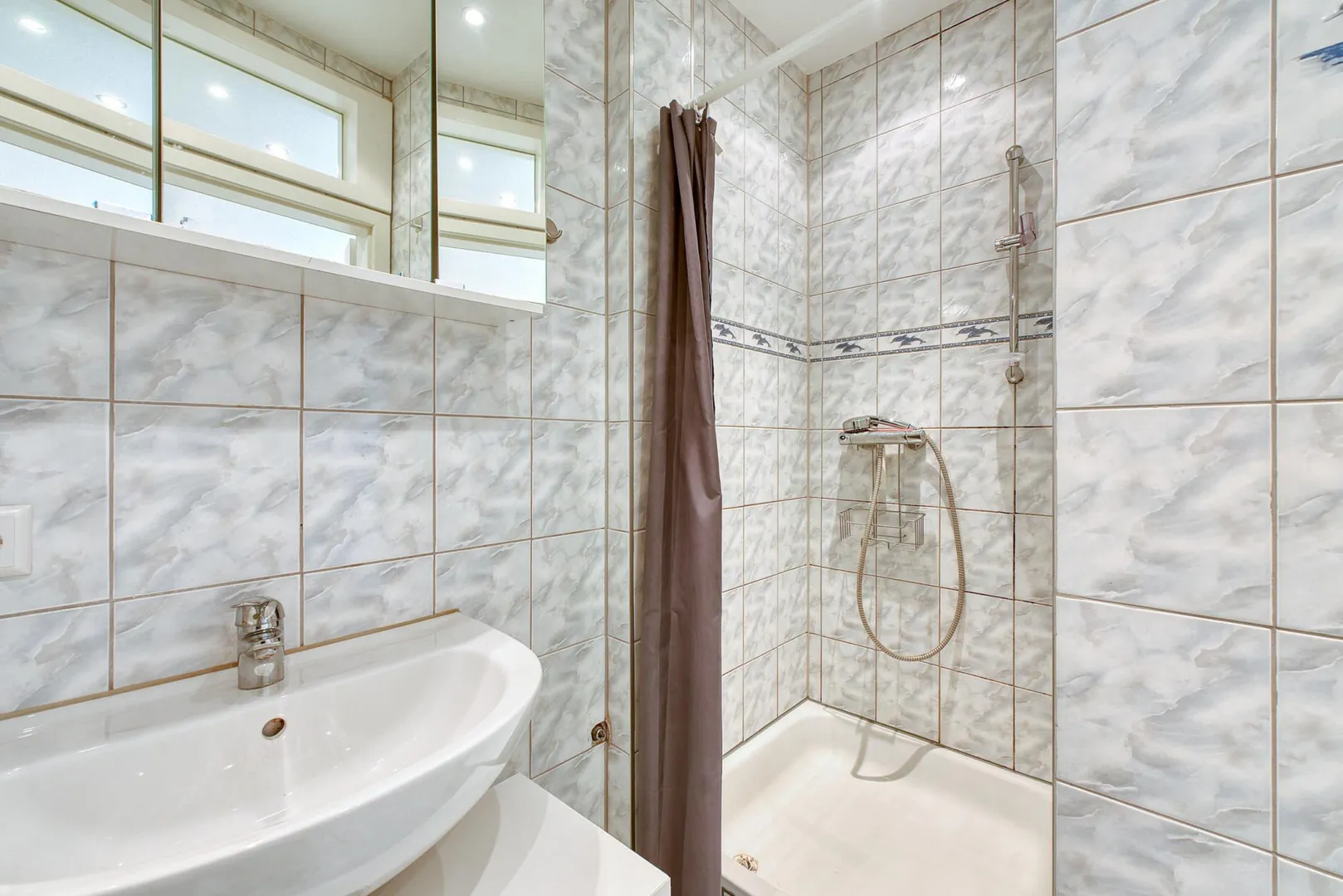 Das raumhoch geflieste Badezimmer ist ausgestattet mit einer Fußboden-Heizung, einer Dusche, einem Spiegelschrank sowie einem Waschmaschinen-Anschluss. Das geflieste WC ist separat.