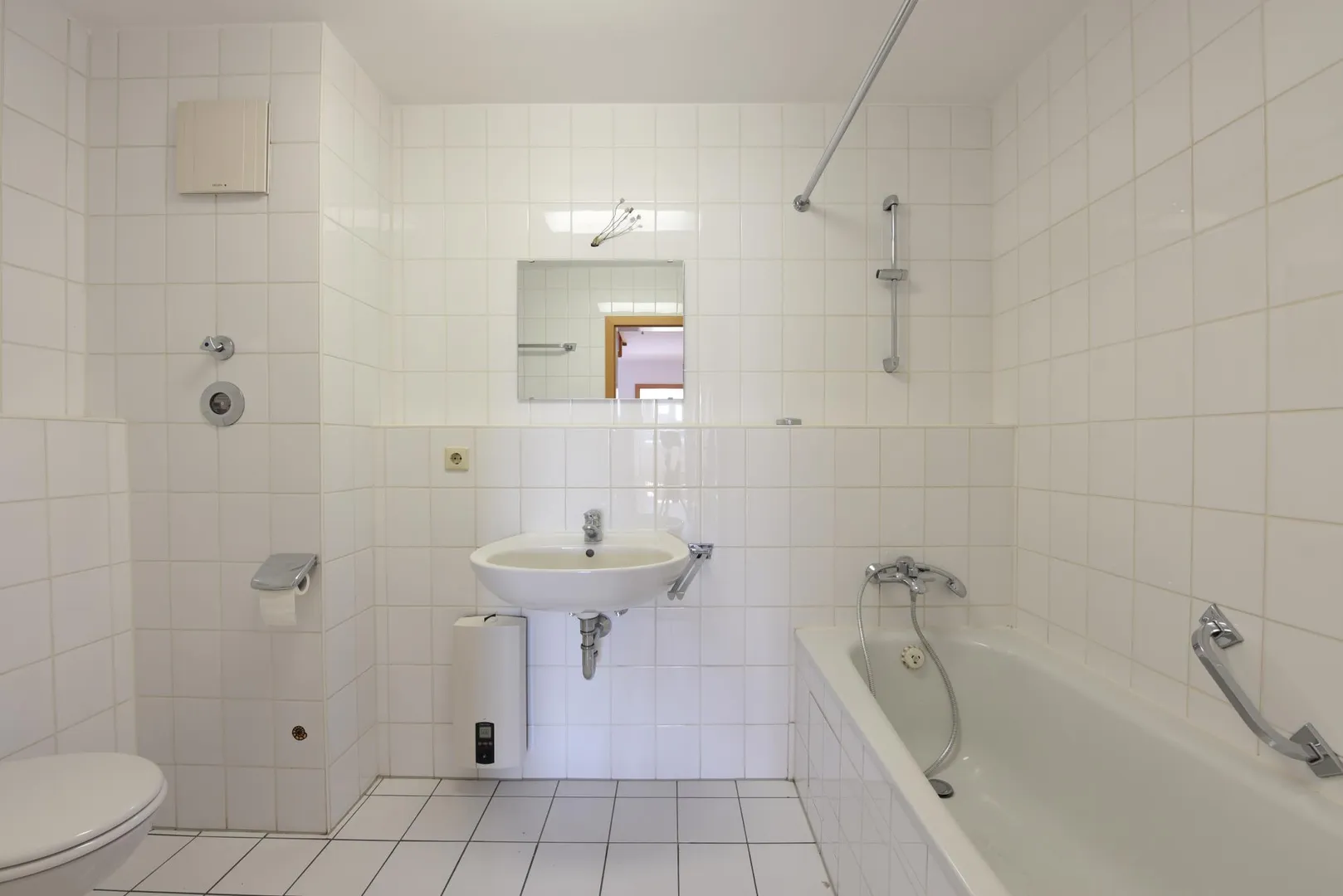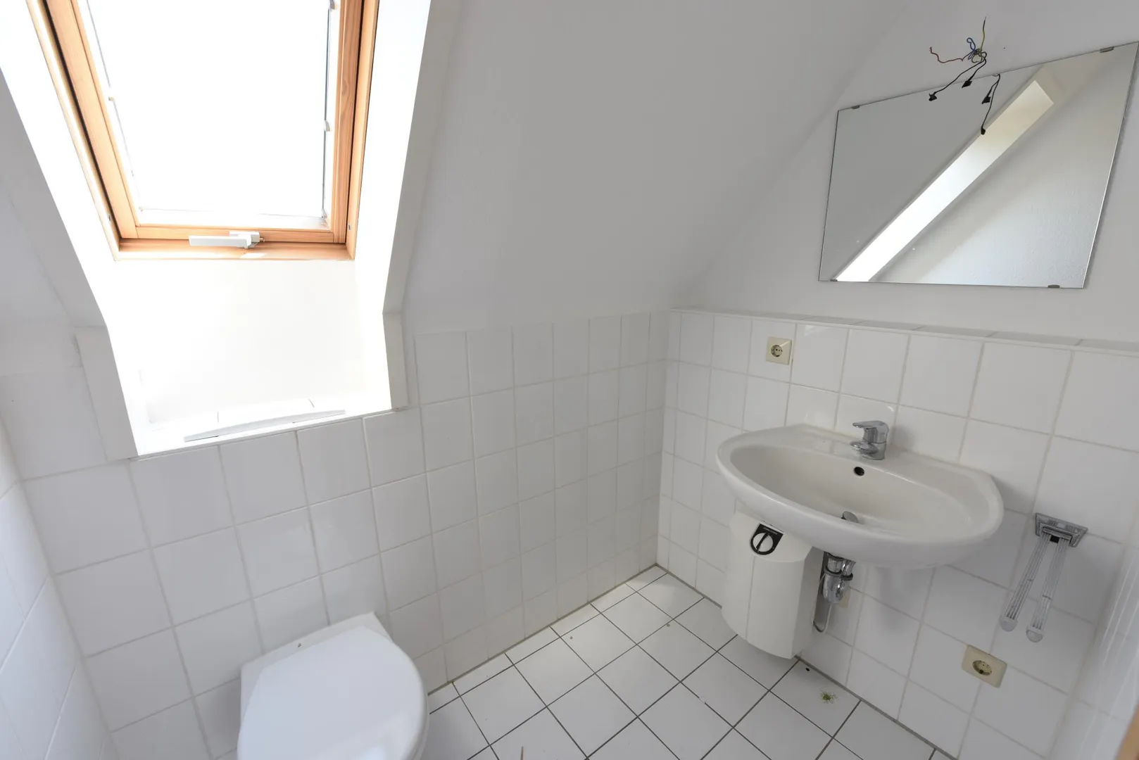 Die Wände sind überwiegend mit Raufasertapete tapeziert und sind frisch, weiß gestrichen.