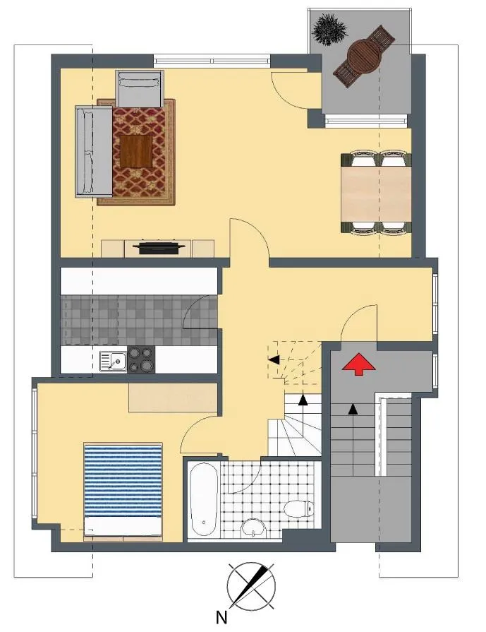Im DG 1 befinden sich das Wohnzimmer mit Balkon, das Schlafzimmer, die Küche und das Badezimmer.
