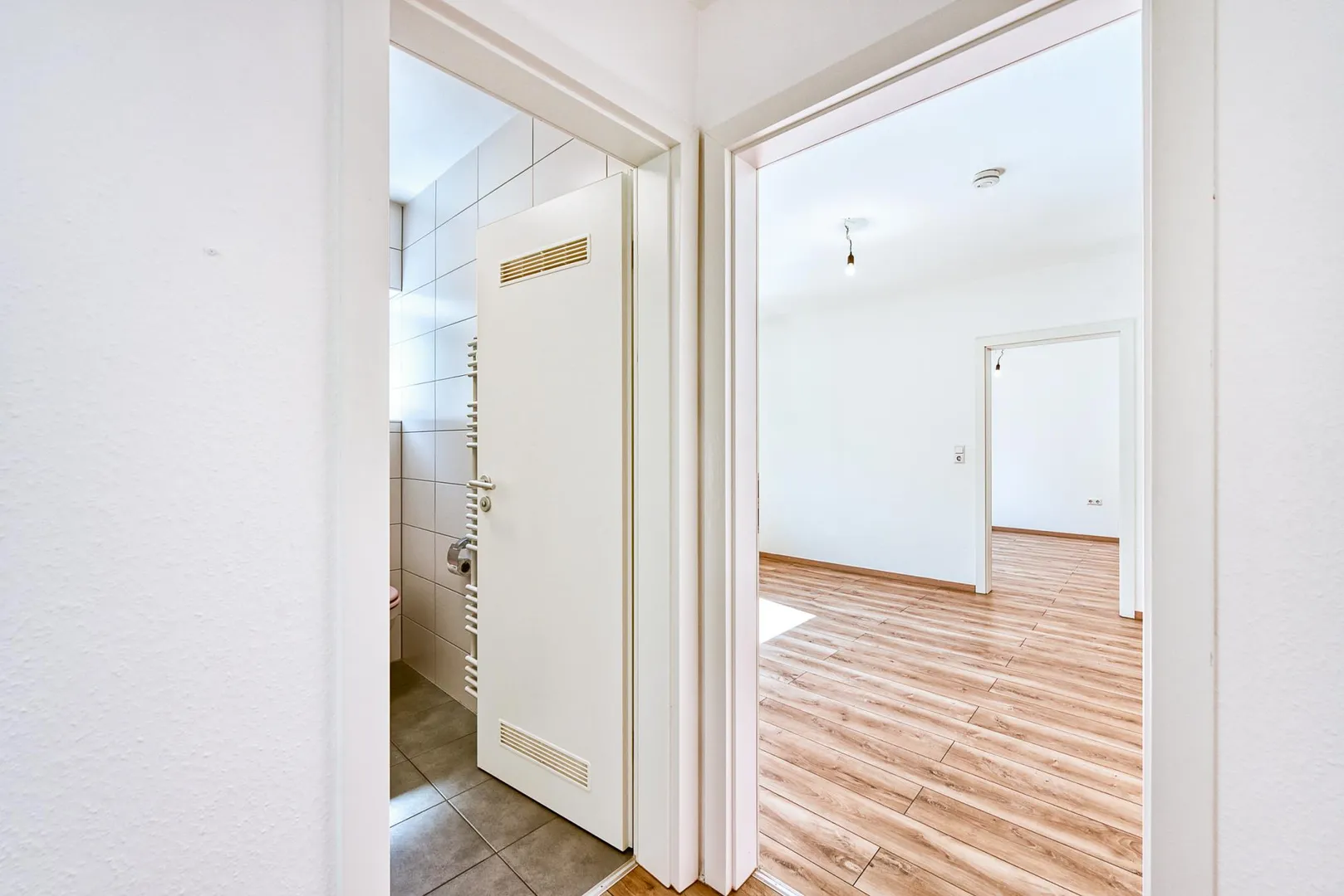 Im Flur und in den Zimmern ist Laminat verlegt. Die Böden in der Küche sowie im Badezimmer sind gefliest.