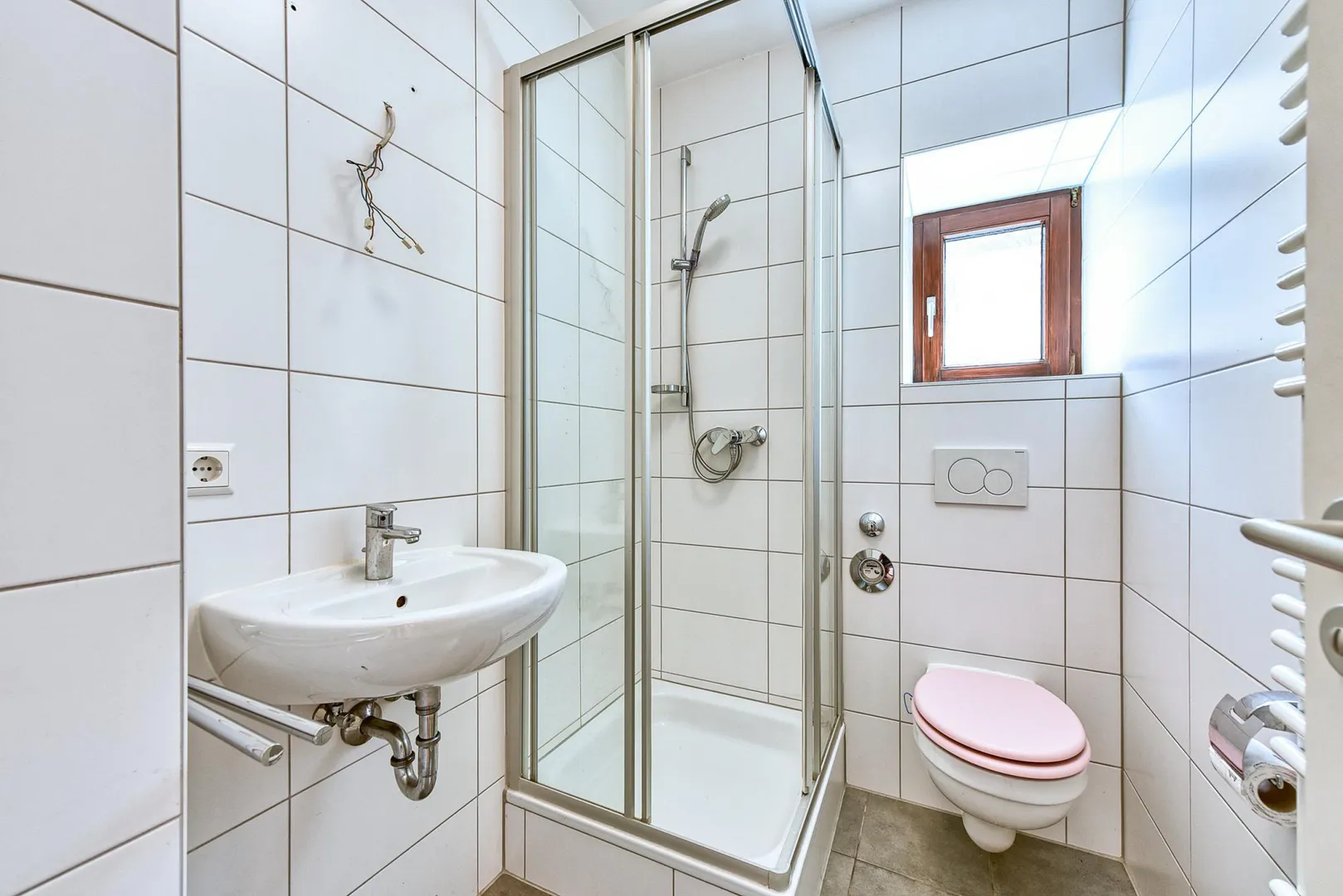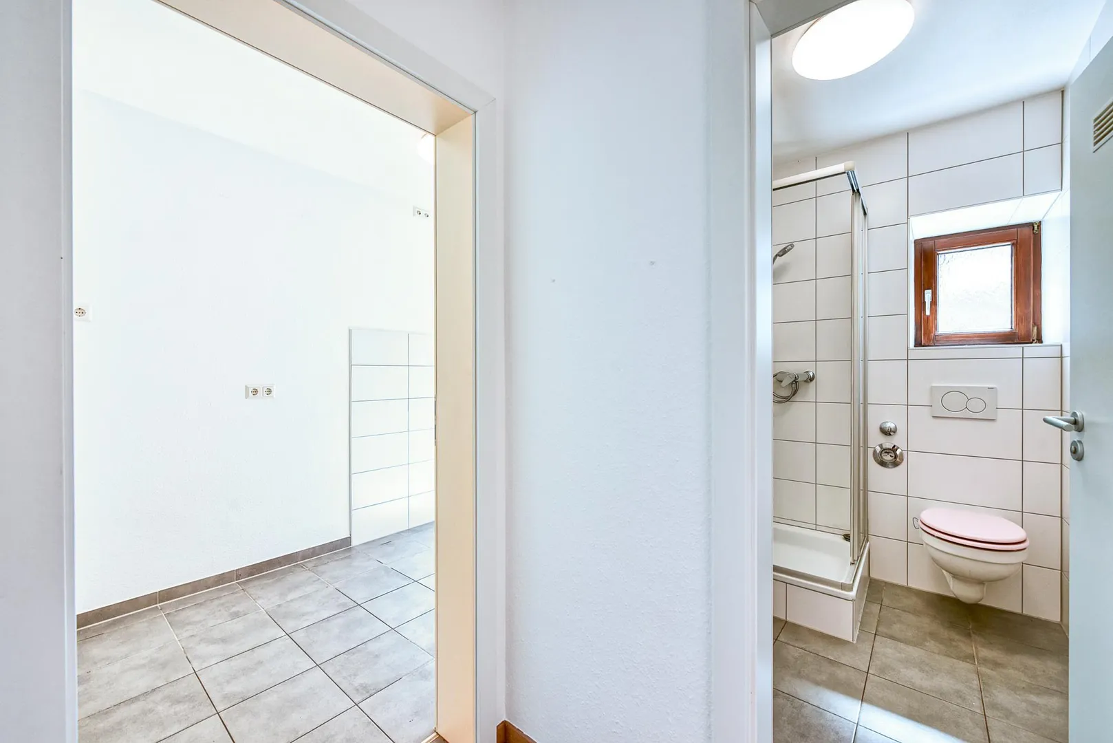 Das raumhoch geflieste Tageslicht-Badezimmer ist ausgestattet mit einer Dusche, einem WC sowie einem Handtuch-Heizkörper.