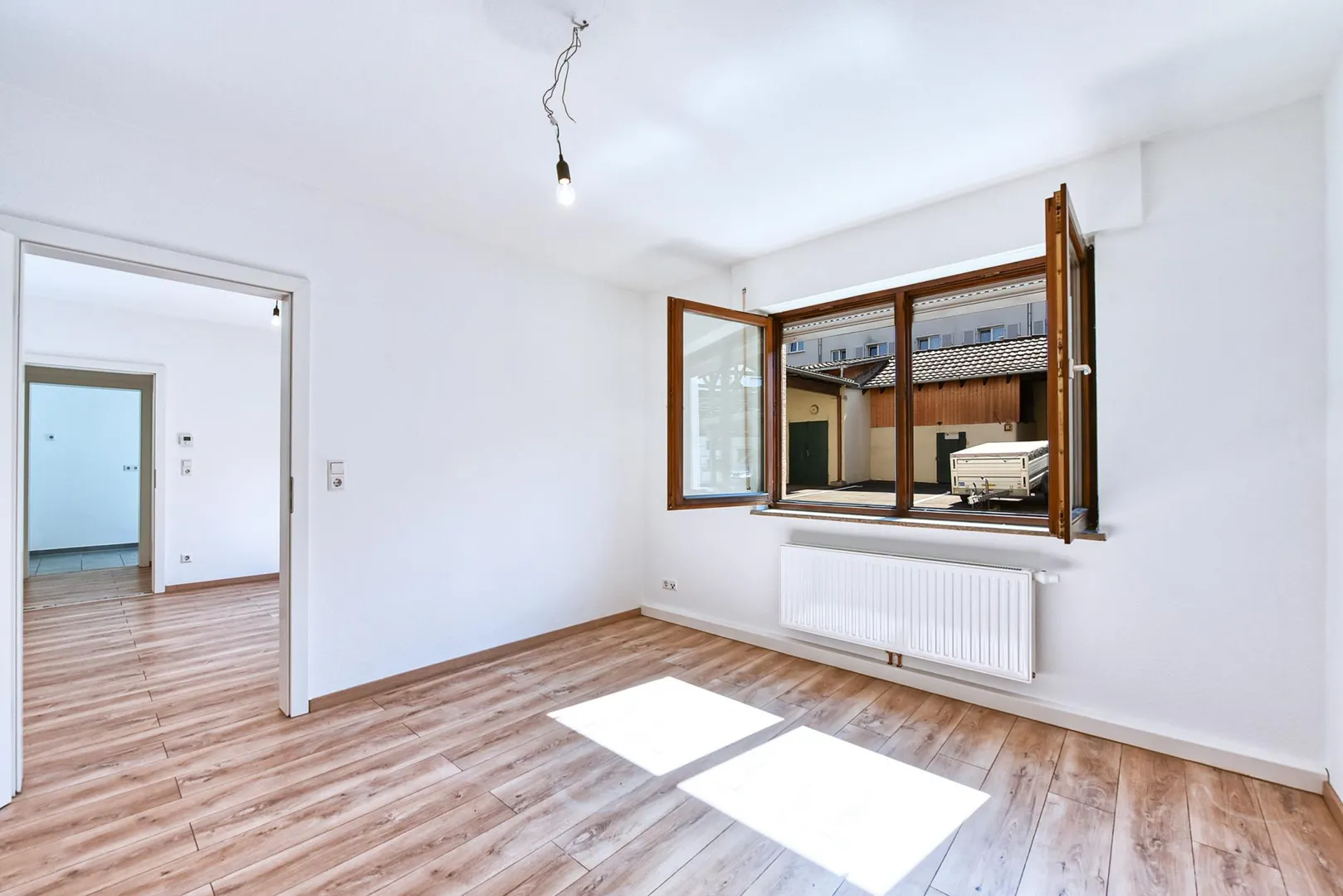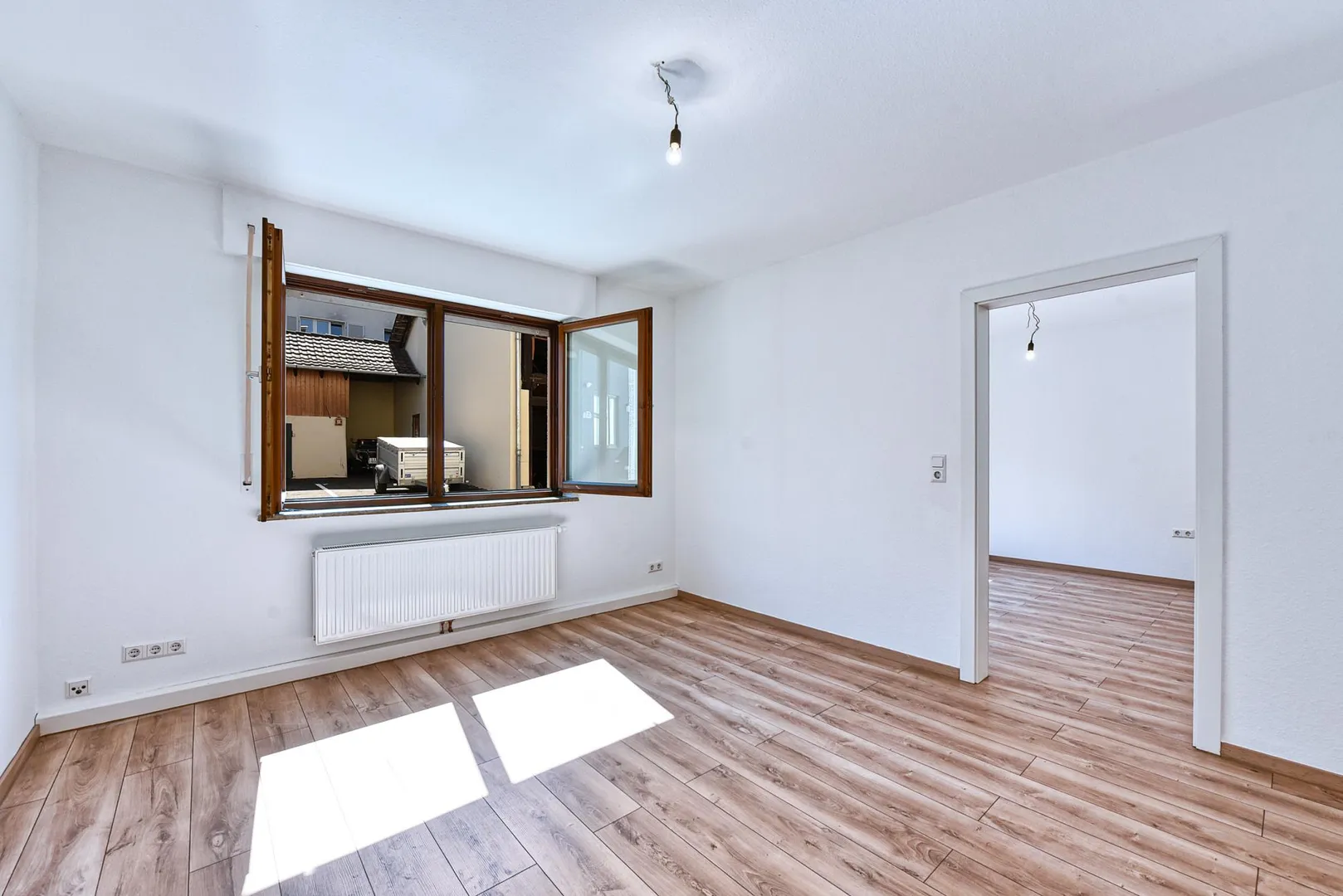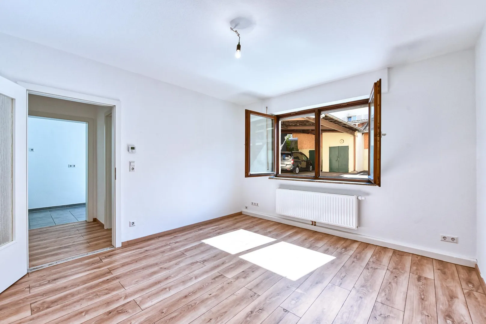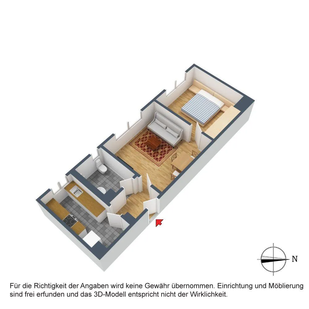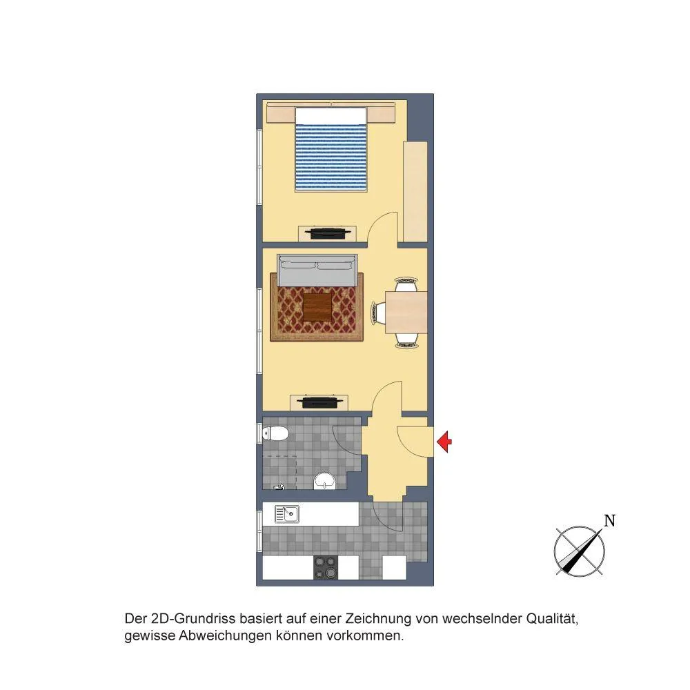 Das Schlafzimmer ist über das Wohnzimmer begehbar. Das Badezimmer mit WC verfügt über ein Fenster.