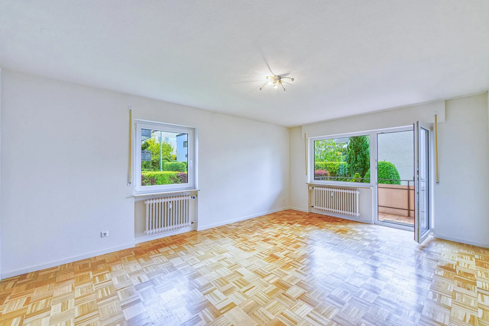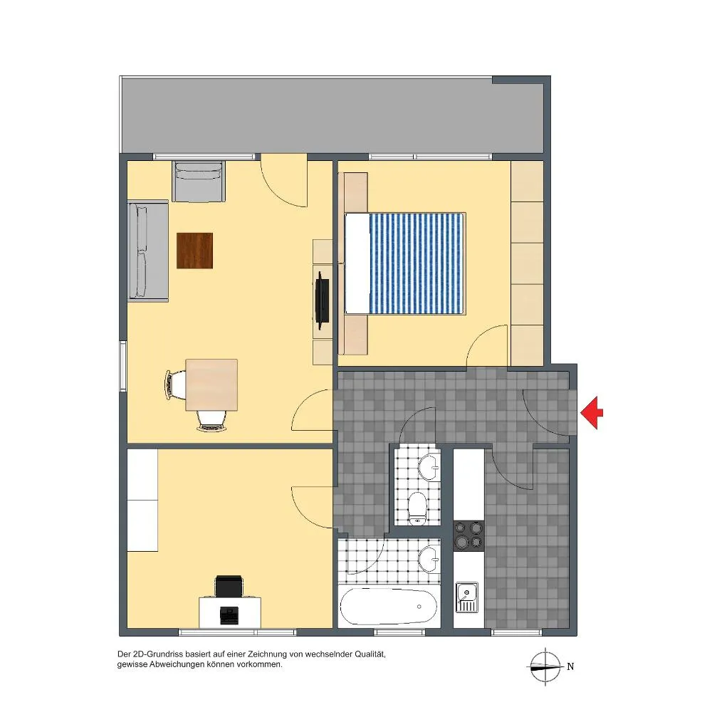 Der Grundriss ist sehr gut. Alle Räume sind direkt vom Flur begehbar. Der ca. 11,5 m² große und überdachte West-Balkon ist über das Wohnzimmer begehbar. Das Badezimmer verfügt über ein Fenster. Das WC ist separat.