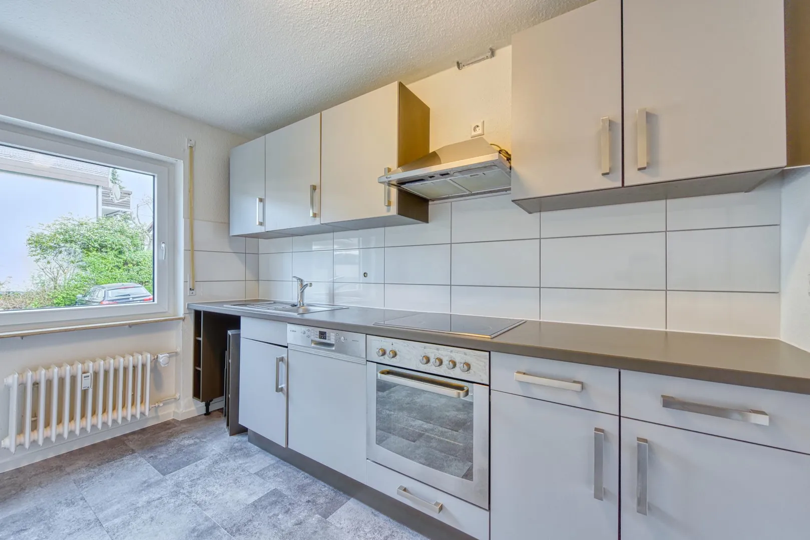 Die Küche verfügt über eine Einbauküche mit Waschmaschinen-Anschluss. Die Einbauküche ist ausgestattet mit einem Herd, einem Backofen, einer Dunstabzugshaube, einer Spülmaschine, Unter- und Oberschränken. Kühlschrank und Gefrierschrank sind nicht vorhanden. Die E-Geräte sind funktionsfähig. Für die künftige Funktionsfähigkeit der E-Geräte übernimmt der Vermieter keine Haftung.