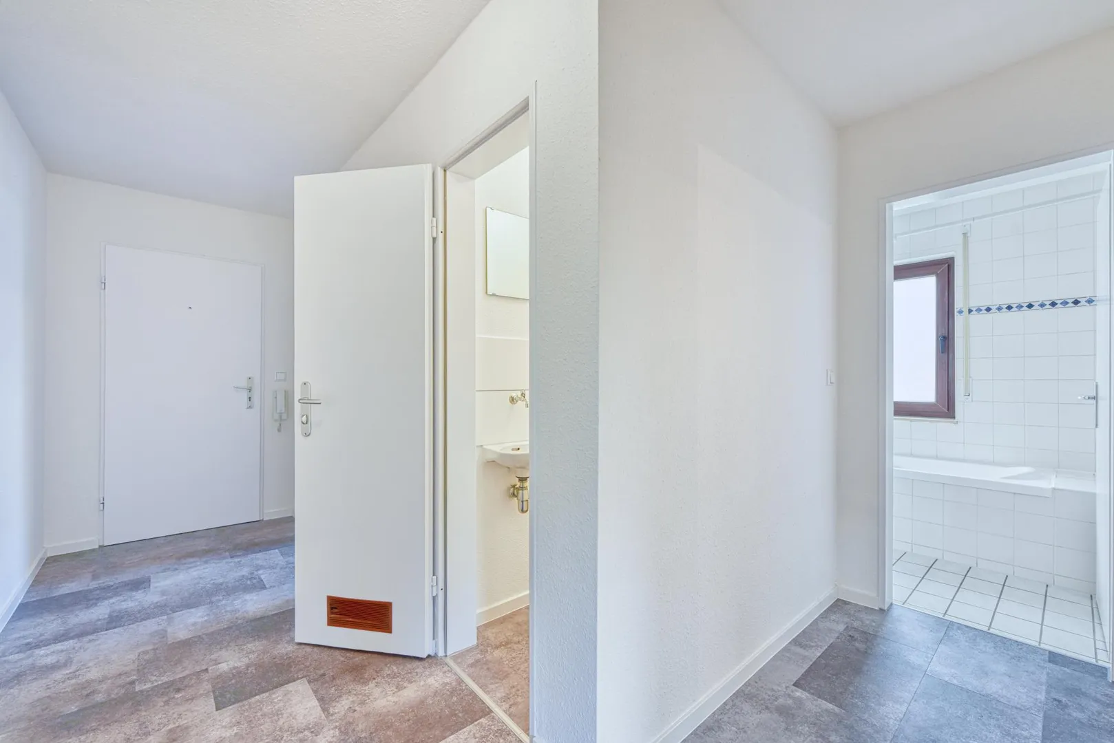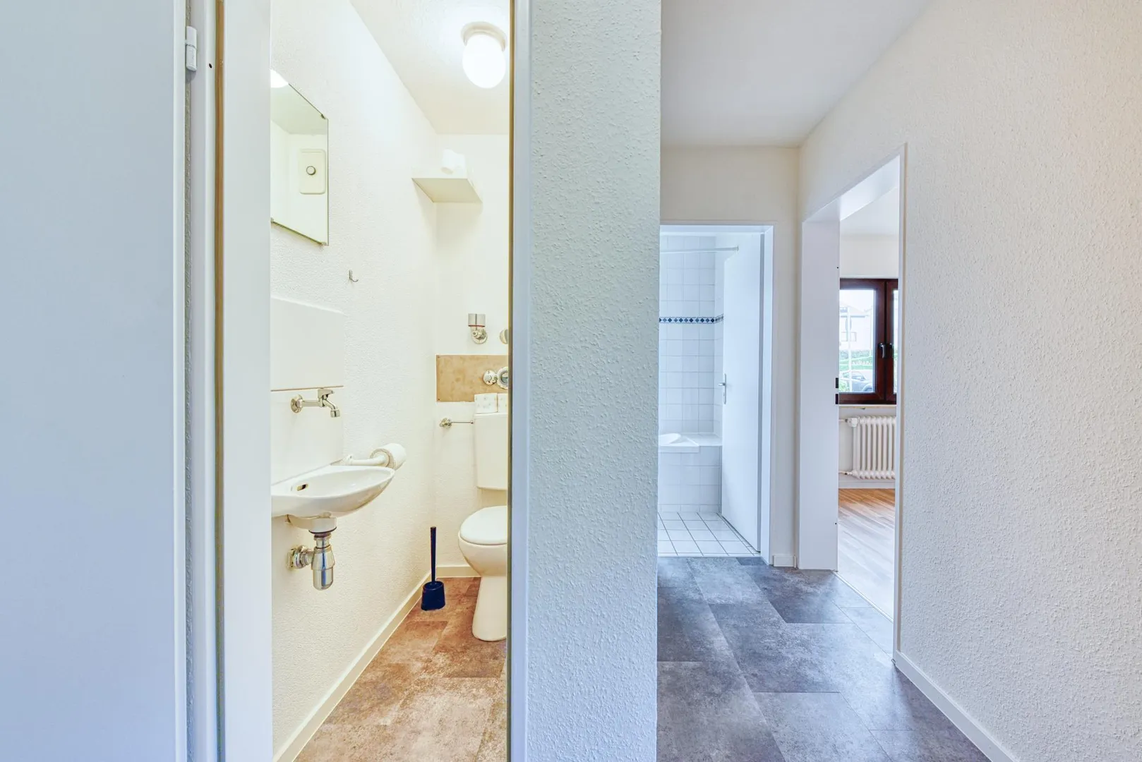 Aktuell wurden die Wände mit Raufasertapeten tapeziert und frisch, weiß gestrichen. Im Flur, in der Küche sowie im WC wurde ein neuer Vinyl-Design-Boden verlegt. Die Türrahmen und Türen wurden frisch, weiß lackiert. Die Rollladengurte wurden erneuert. Alle Lichtschalter und Steckdosen wurden erneuert.