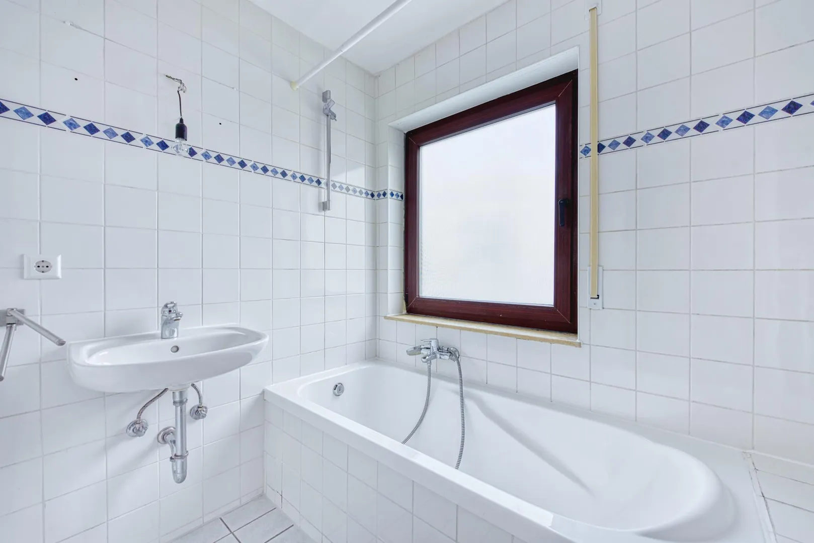 Das raumhoch geflieste Tageslicht-Bad ist ausgestattet mit einem Fliesenboden sowie einer Badewanne.