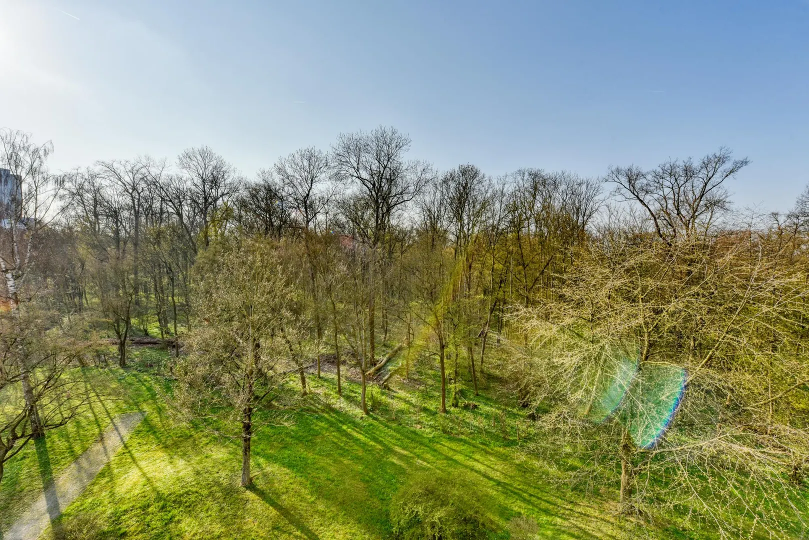 Das Hochhaus liegt in einer Alleinlage direkt am Waldrand sowie an einem Fußball- und Tennisverein.
