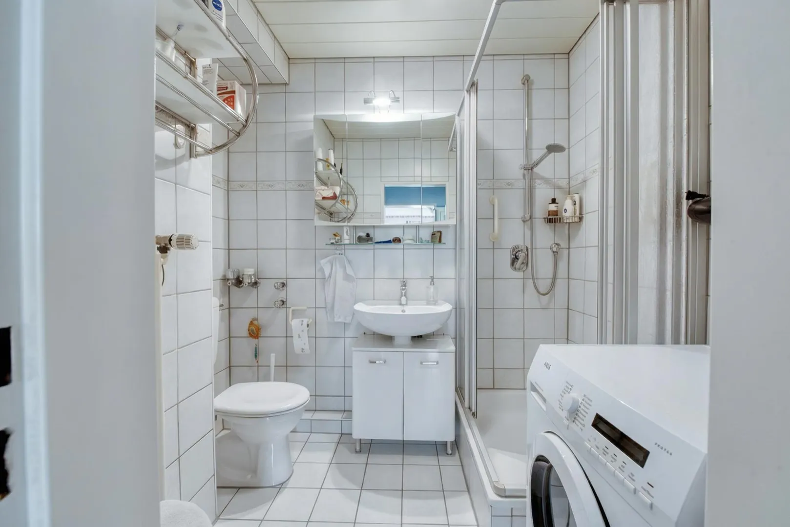 Das raumhoch geflieste Badezimmer wurde ca. 2000 modernisiert und ist ausgestattet mit einer Dusche, einem WC sowie einem Waschmaschinenanschluss.