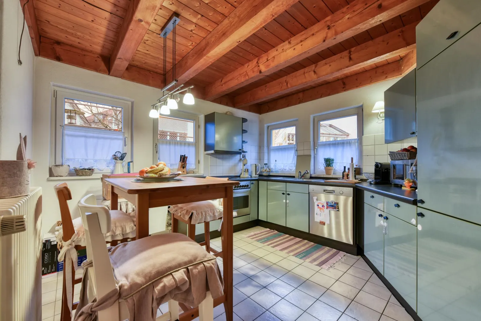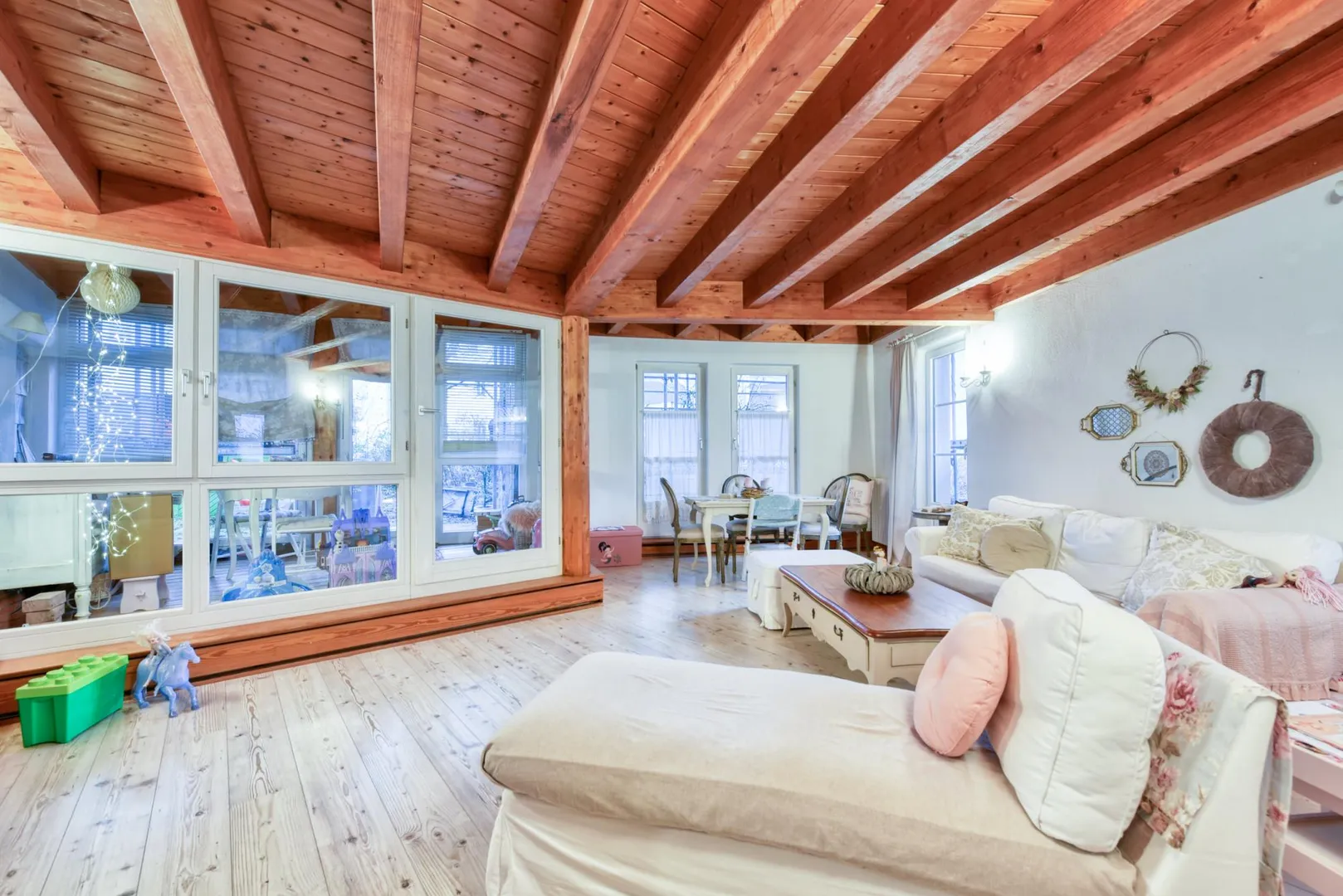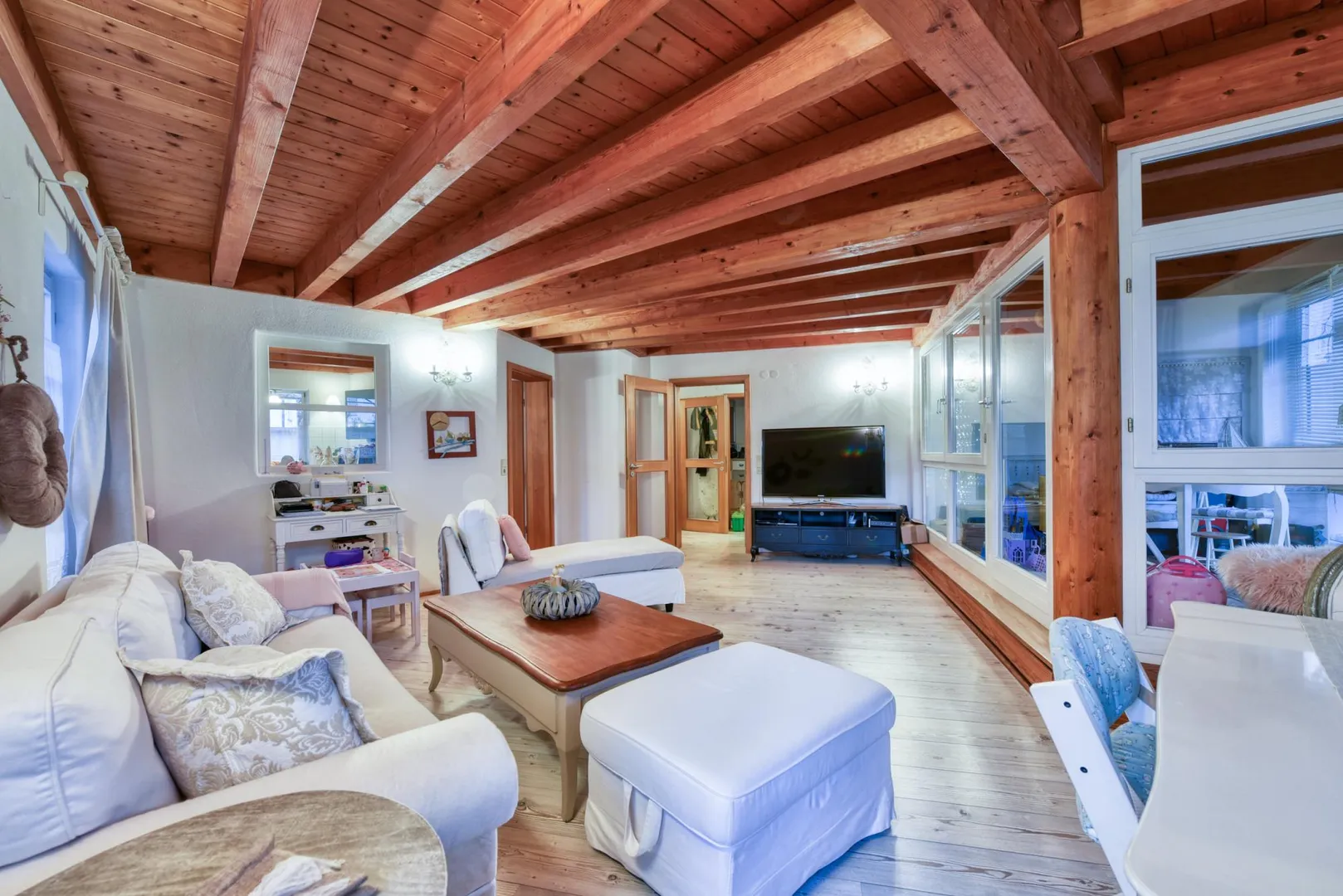 Das Wohnzimmer sowie die Küche sind mit einer Holzdecke mit Holzbalken ausgestattet.