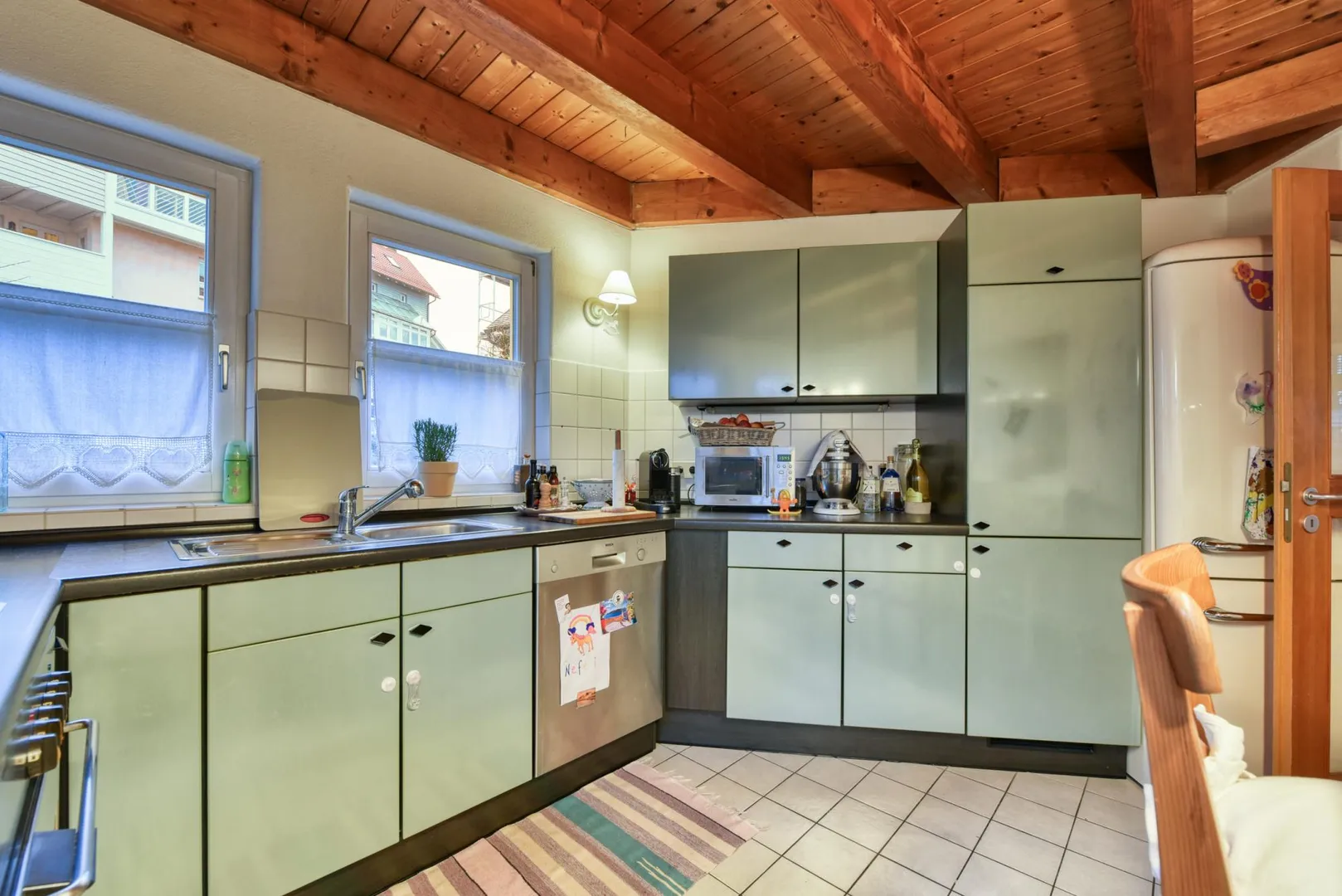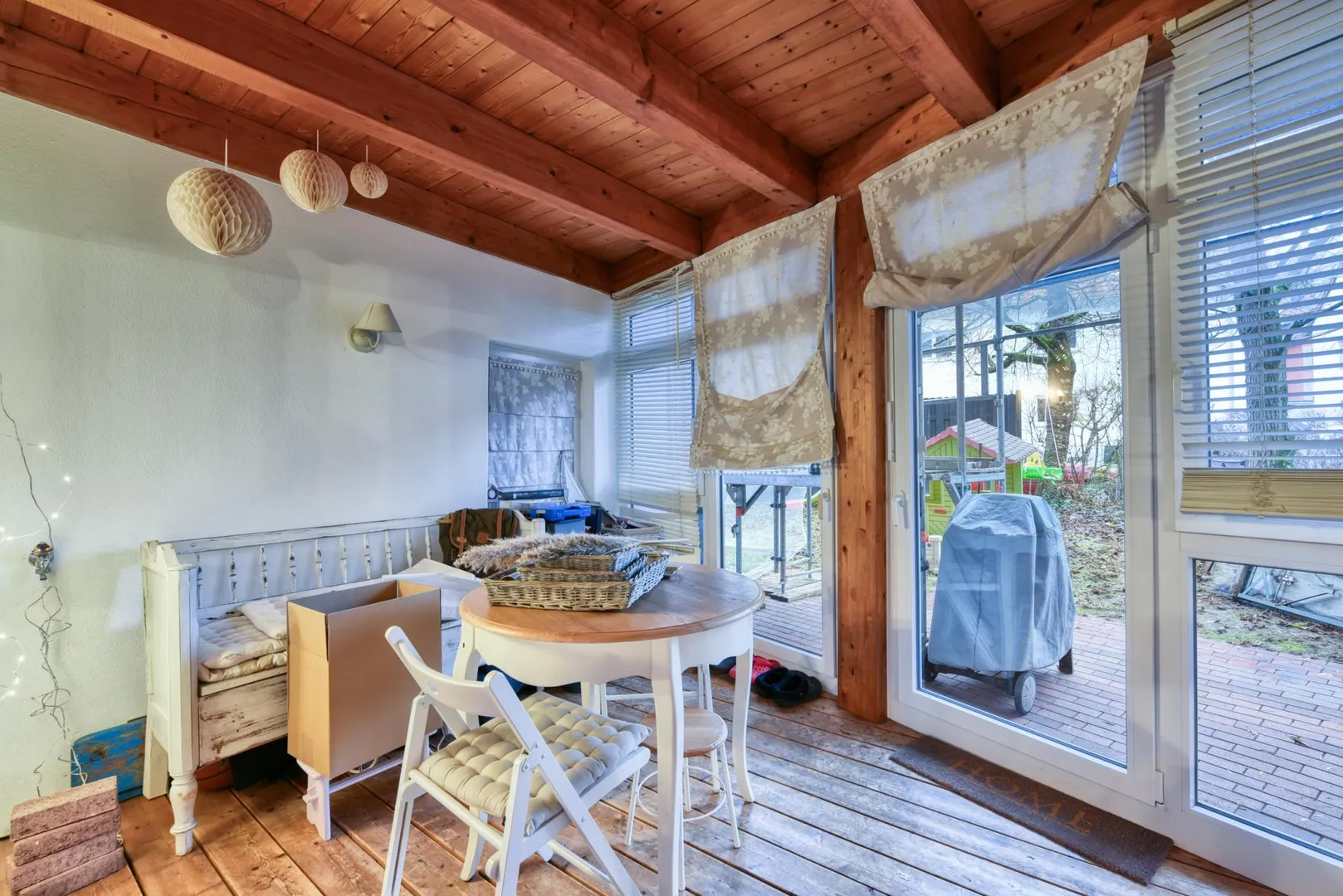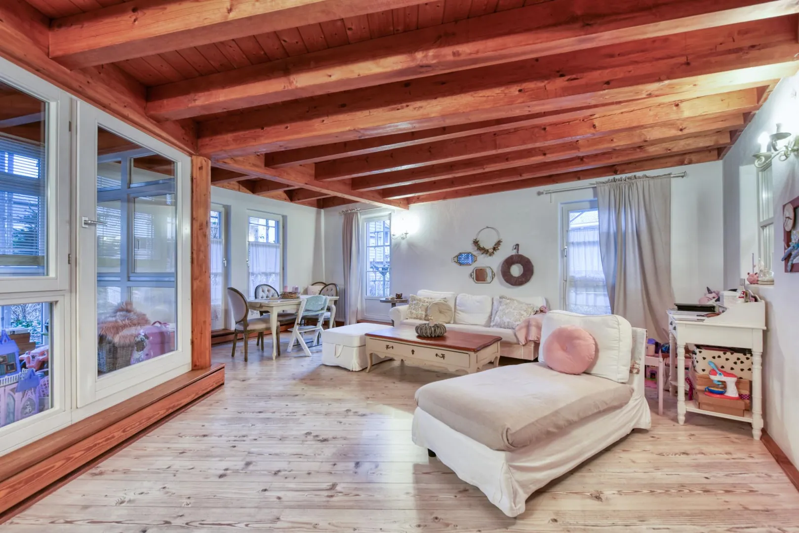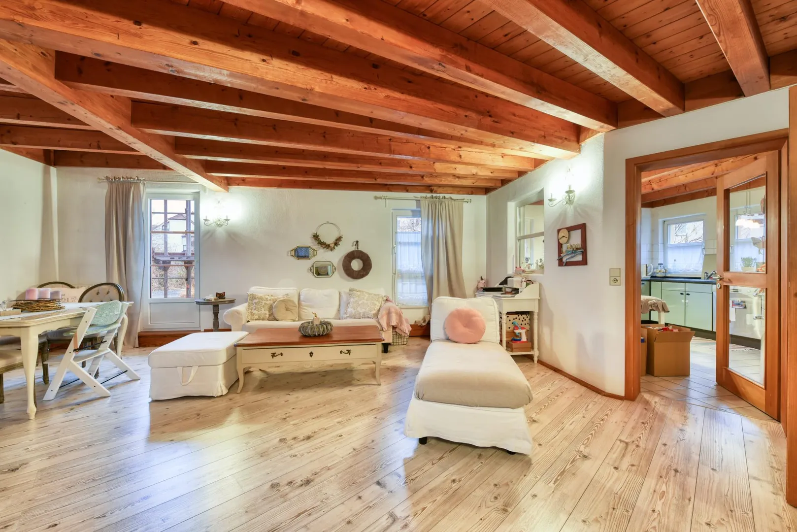 Das Wohnzimmer sowie die Küche sind mit einer Holzdecke mit Holzbalken ausgestattet.