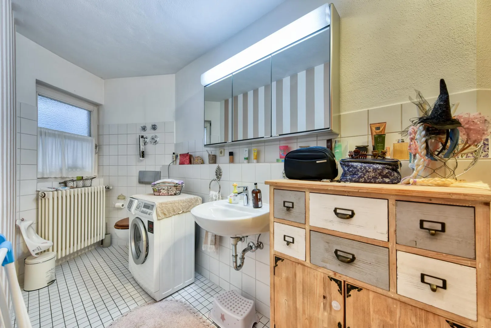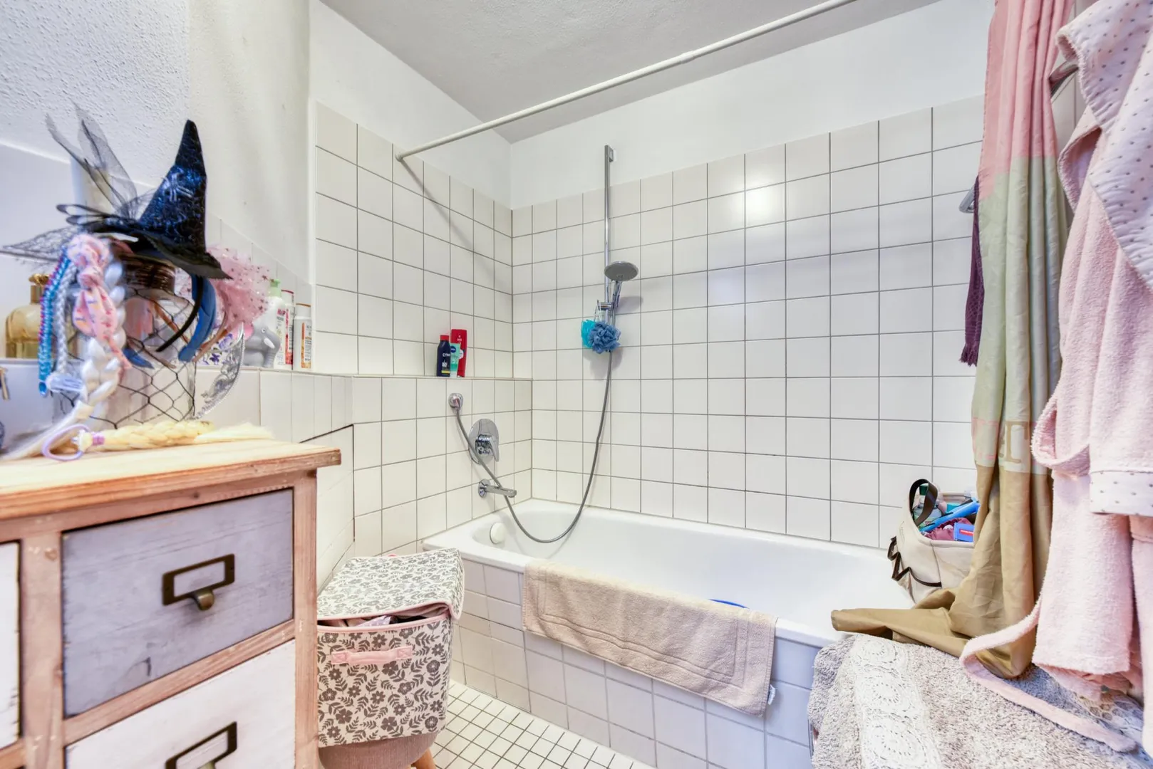 Das teilweise 2/3-hoch geflieste Tageslicht-Badezimmer ist ausgestattet mit einer Badewanne, einem WC, einem Waschmaschinen-Anschluss sowie einem belichteten Spiegelschrank.