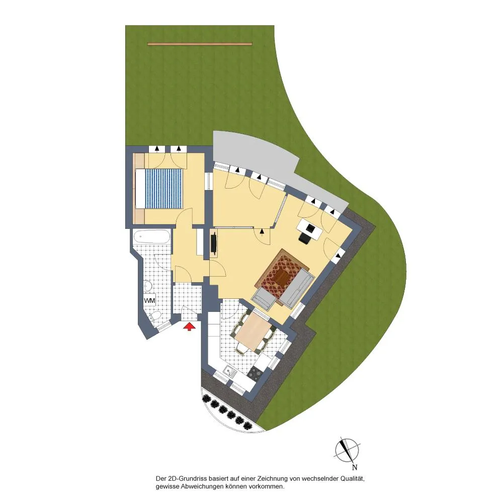 Der Grundriss ist gut. Das Badezimmer verfügt über ein Fenster. Der Wintergarten sowie die Terrasse sind über das Wohnzimmer begehbar. Die Grünfläche ist über beide Zimmer begehbar.