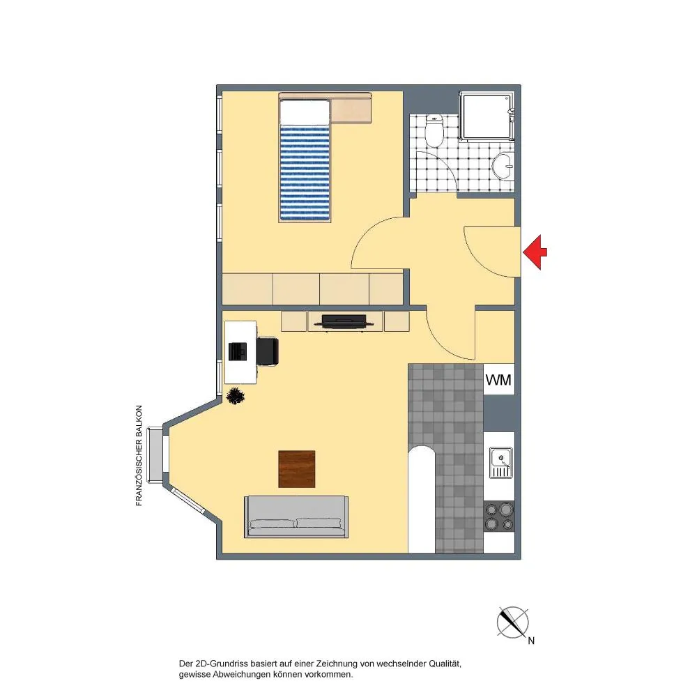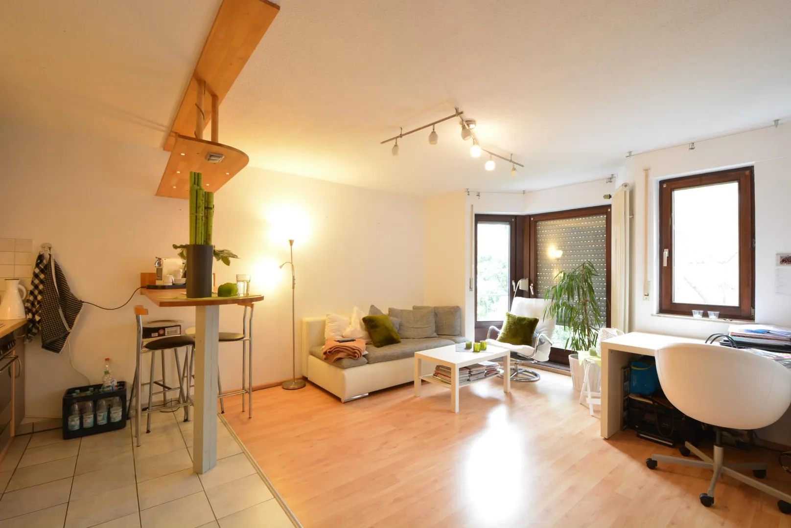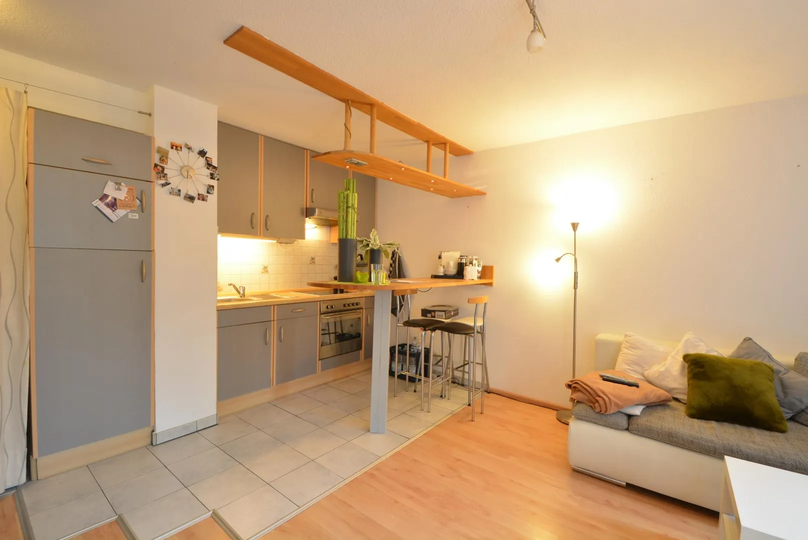Der Küchenbereich ist gefliest. Der Wohnbereich ist mit einem Laminatboden, einem Erker und einem französichen Balkon ausgestattet.