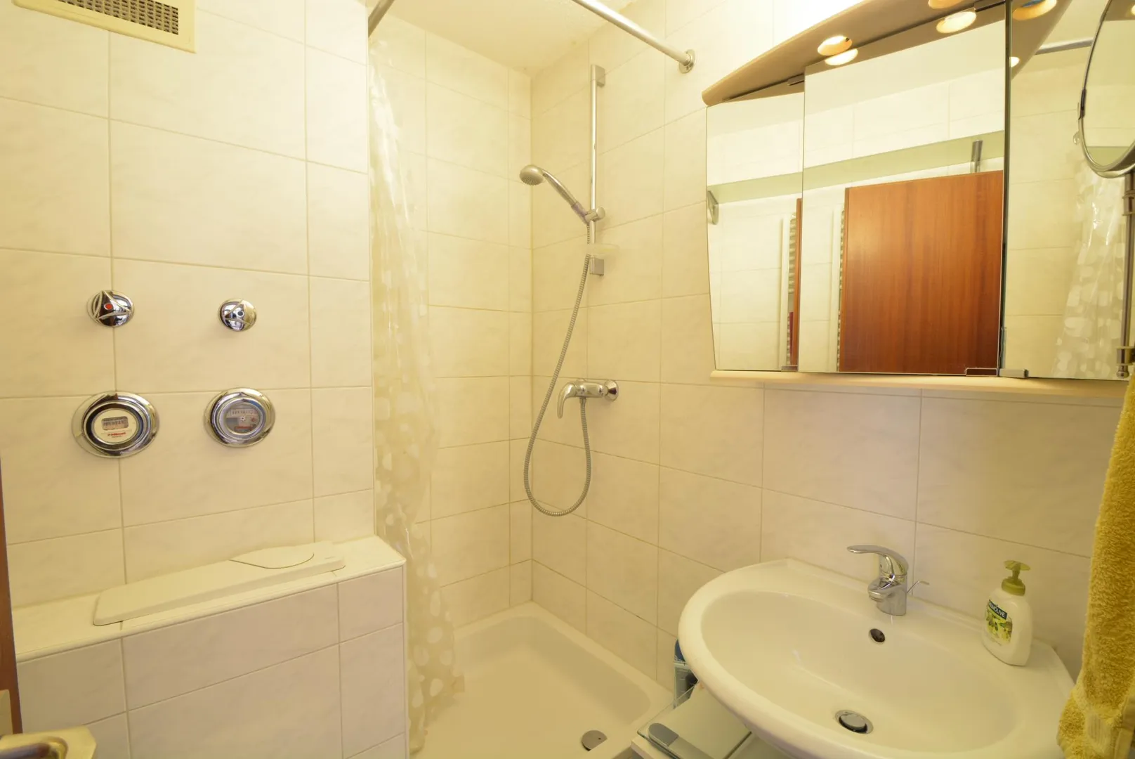 Das Badezimmer wurde ca. 2011 modernisiert und ist ausgestattet mit einer Dusche, einem WC, einem Spiegelschrank und einem Regal.