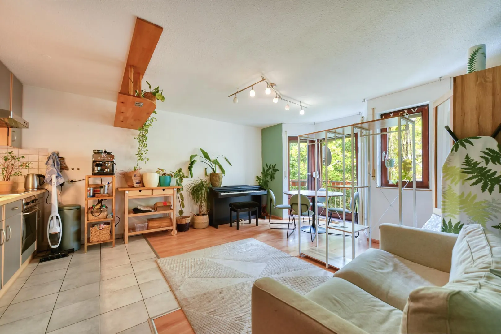 Der Küchenbereich ist gefliest. Der Wohnbereich ist mit einem Laminatboden, einem Erker sowie einem französischen Balkon ausgestattet.