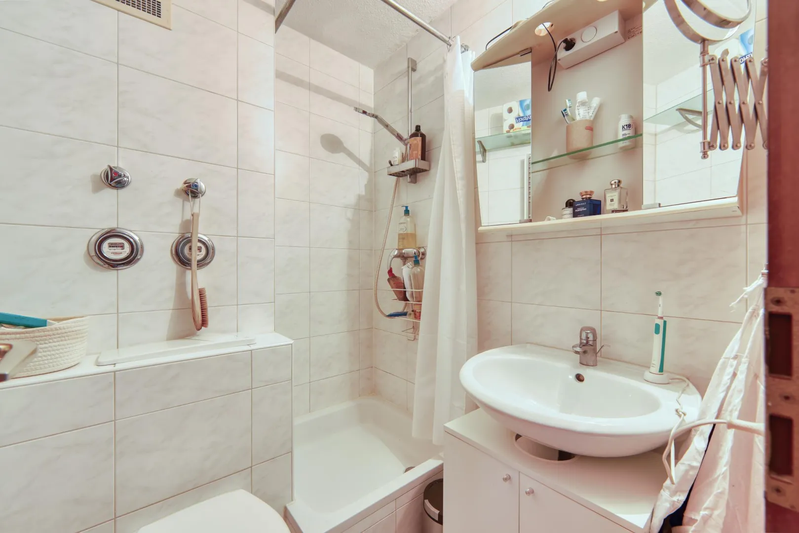 Das Badezimmer wurde ca. 2011 modernisiert und ist ausgestattet mit einer Dusche, einem WC, einem Spiegelschrank und einem Regal.