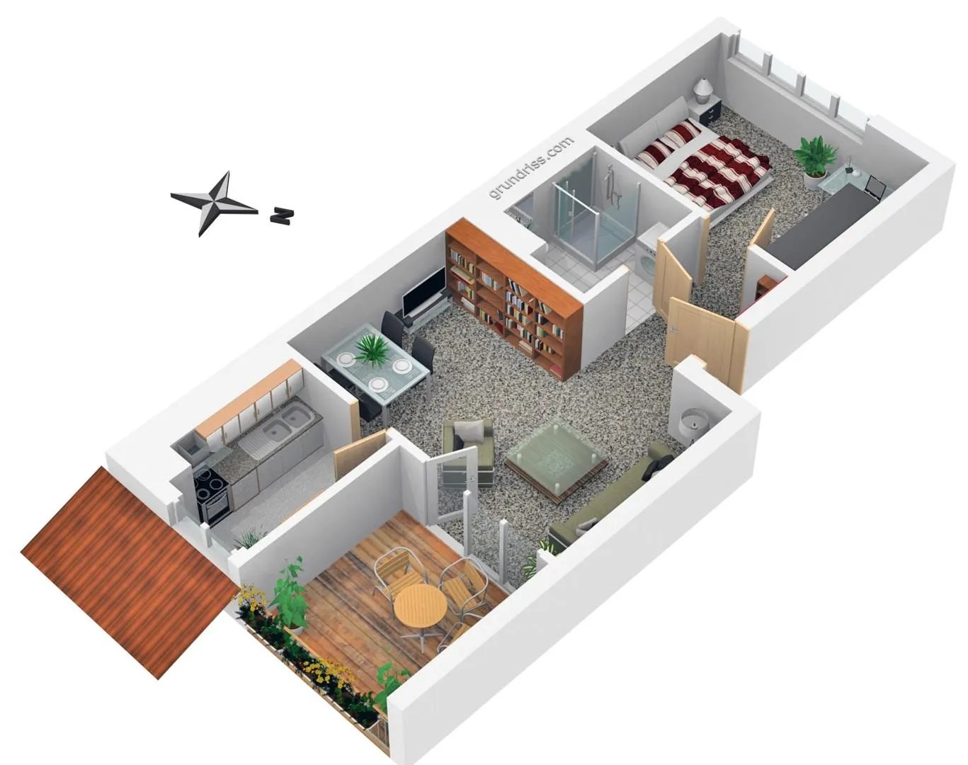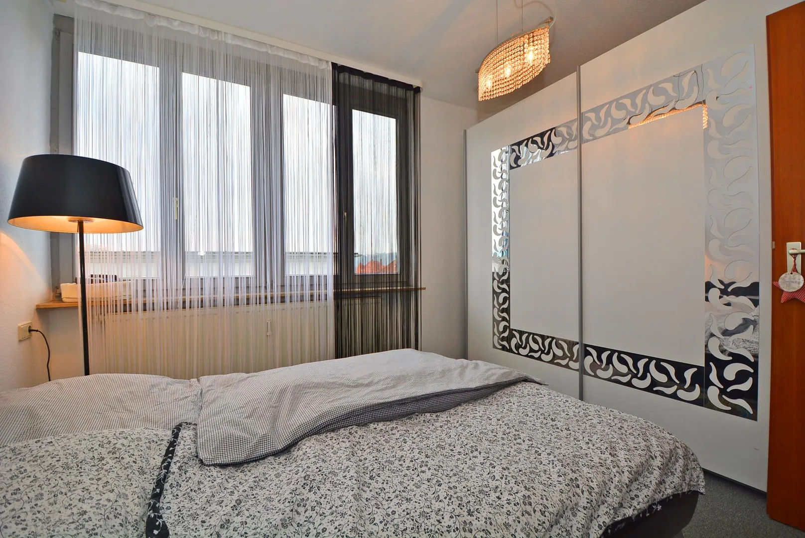 Das Wohnzimmer und die Küche sind nach Süd-/Osten ausgerichtet. Das Schlafzimmer ist nach Nord-/Westen ausgerichtet.