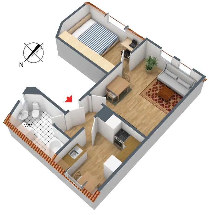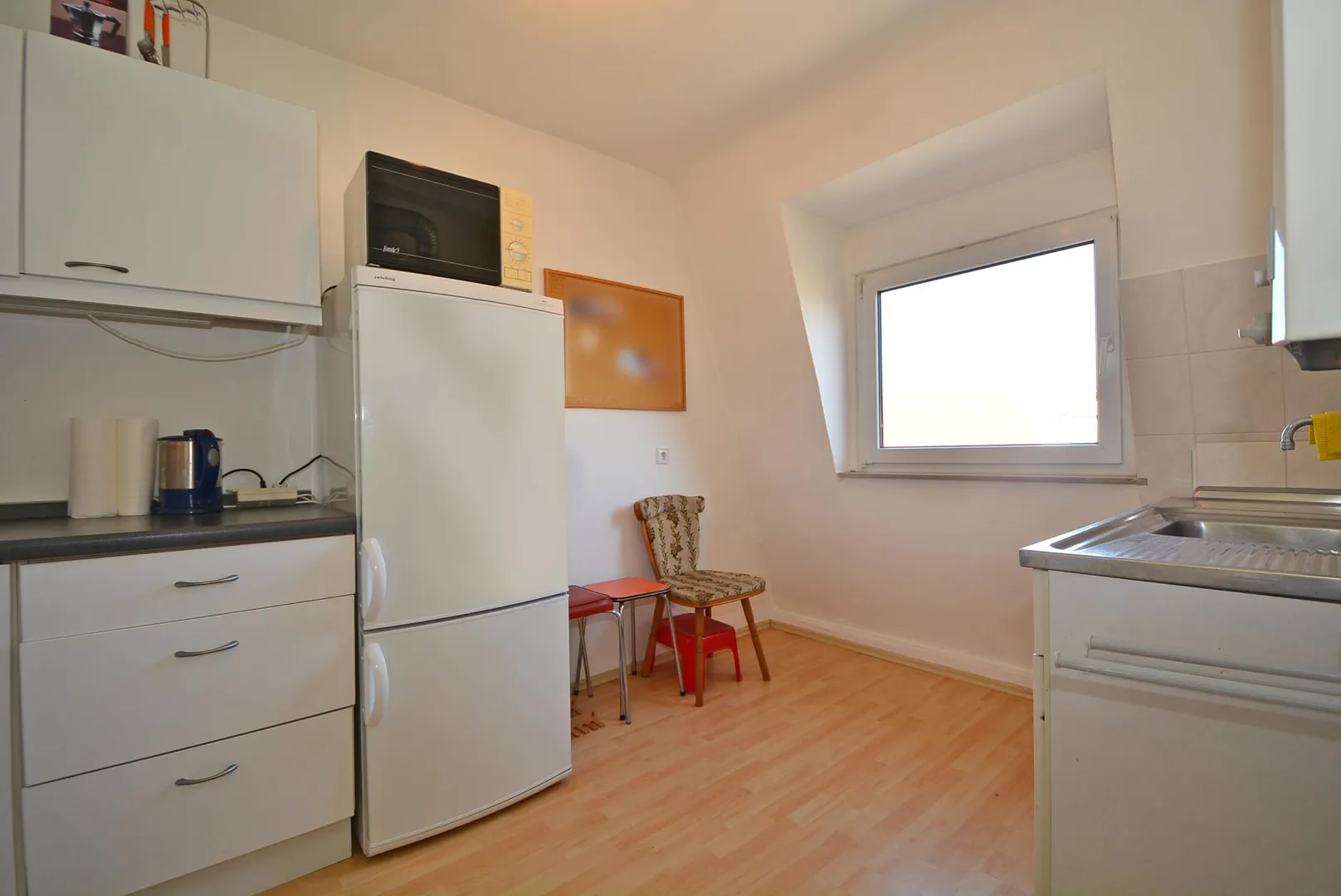 Diese schicke und gemütliche 2-Zimmer-Dachgeschoss-Etagen-Wohnung mit wenig Schrägen für eine/n Nichtraucher/in befindet sich im 2. Obergeschoss.