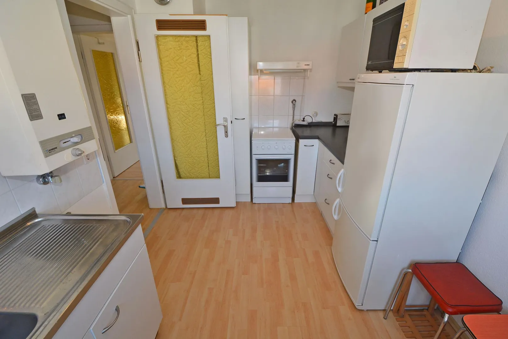 Die Küche ist mit einem Gas-Herd mit Backofen von 2006, Dunstabzug sowie einer Spüle mit Unterschrank ausgestattet. Die weiteren Küchenmöbel sowie ein Kühlschrank mit Gefrierfach können ggf. vom aktuellen Mieter übernommen werden.