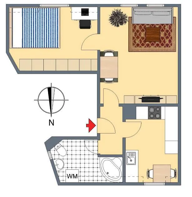 Das Schlafzimmer ist über das Wohnzimmer begehbar. Die Wohnung verfügt über keinen Balkon.