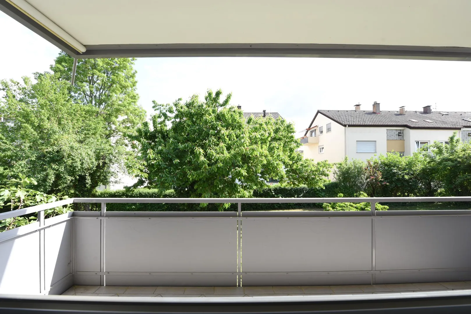 Der ca. 7,5 m² große und überdachte Süd-Balkon ist vom Wohnzimmer, von der Küche und vom Schlafzimmer begehbar.