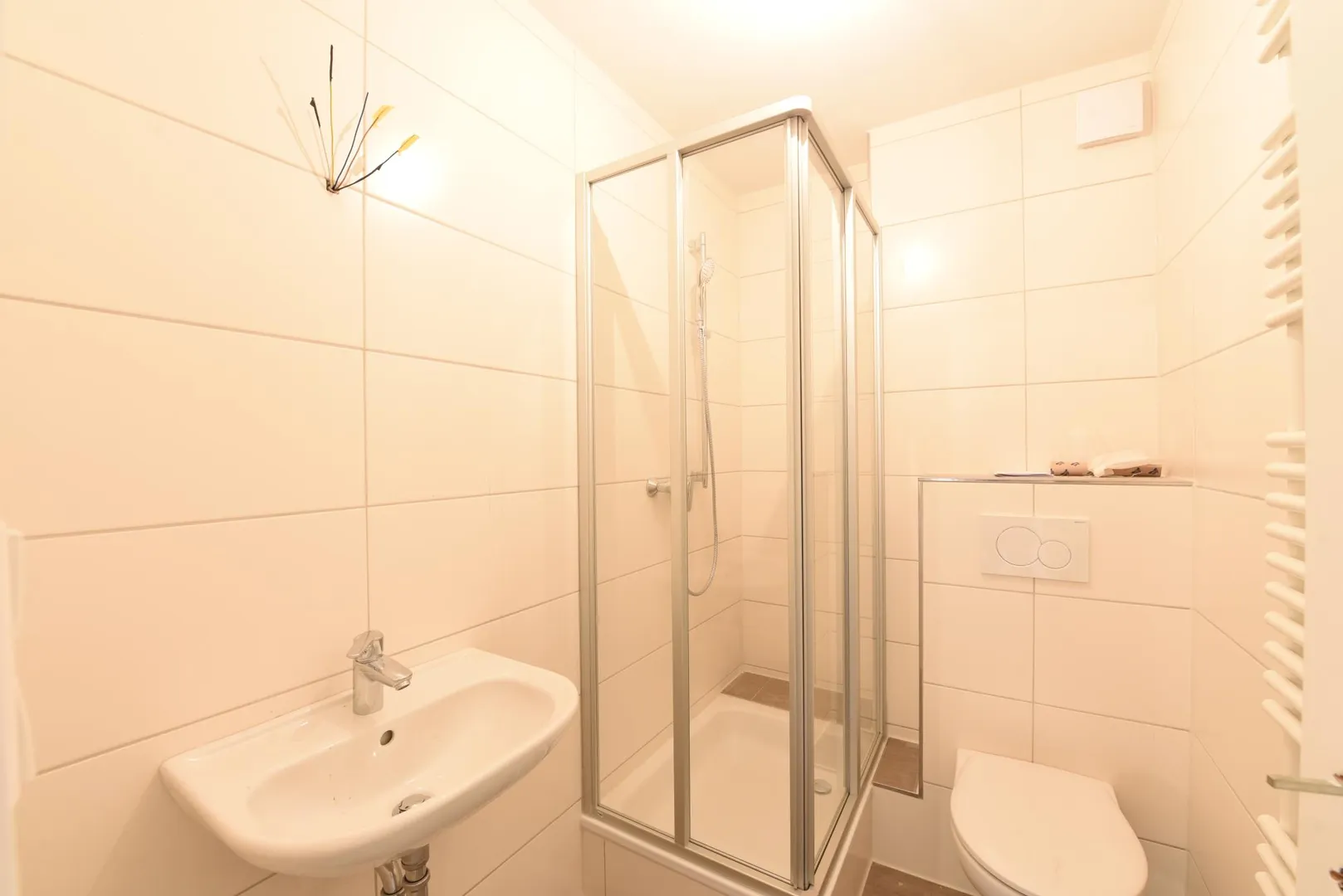 Das raumhoch geflieste Badezimmer, ausgestattet mit einem Fliesenboden, einer Dusche sowie einem WC ist neu.