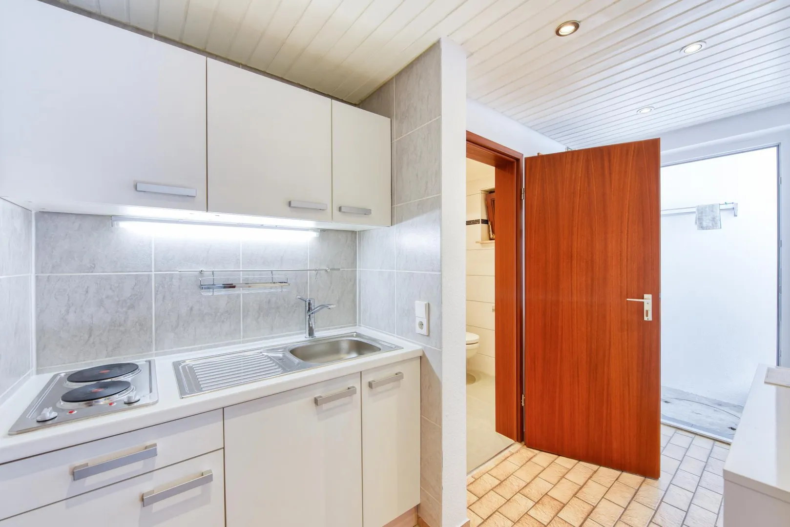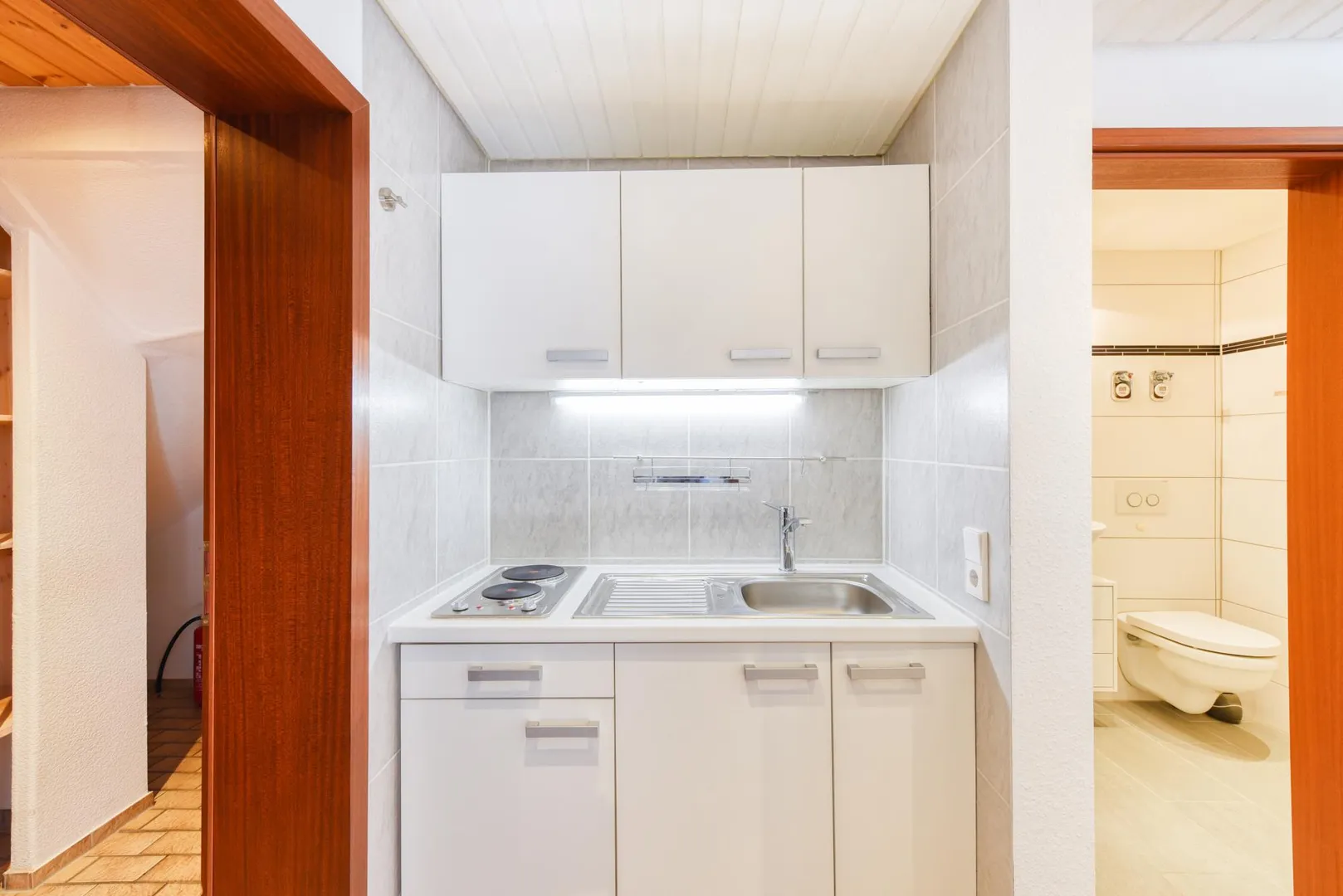 Ebenfalls wurde eine neue, kleine Einbauküche eingebaut. Die Küchenzeile befindet sich im Flur. Die Küchenzeile ist ausgestattet mit einem Herd mit zwei Kochplatten, einer Spüle, Unter- und Oberschränken. Ein Kühlschrank ist im Abstellraum vorhanden. Die Küche verfügt über keine Spülmaschine, keinen Gefrierschrank und keinen Backofen.
