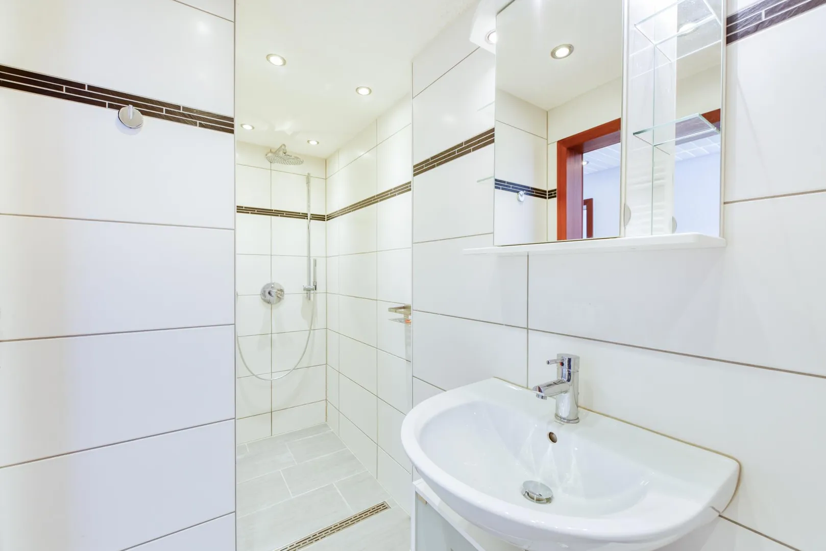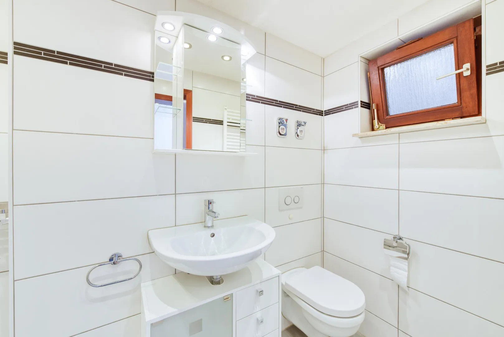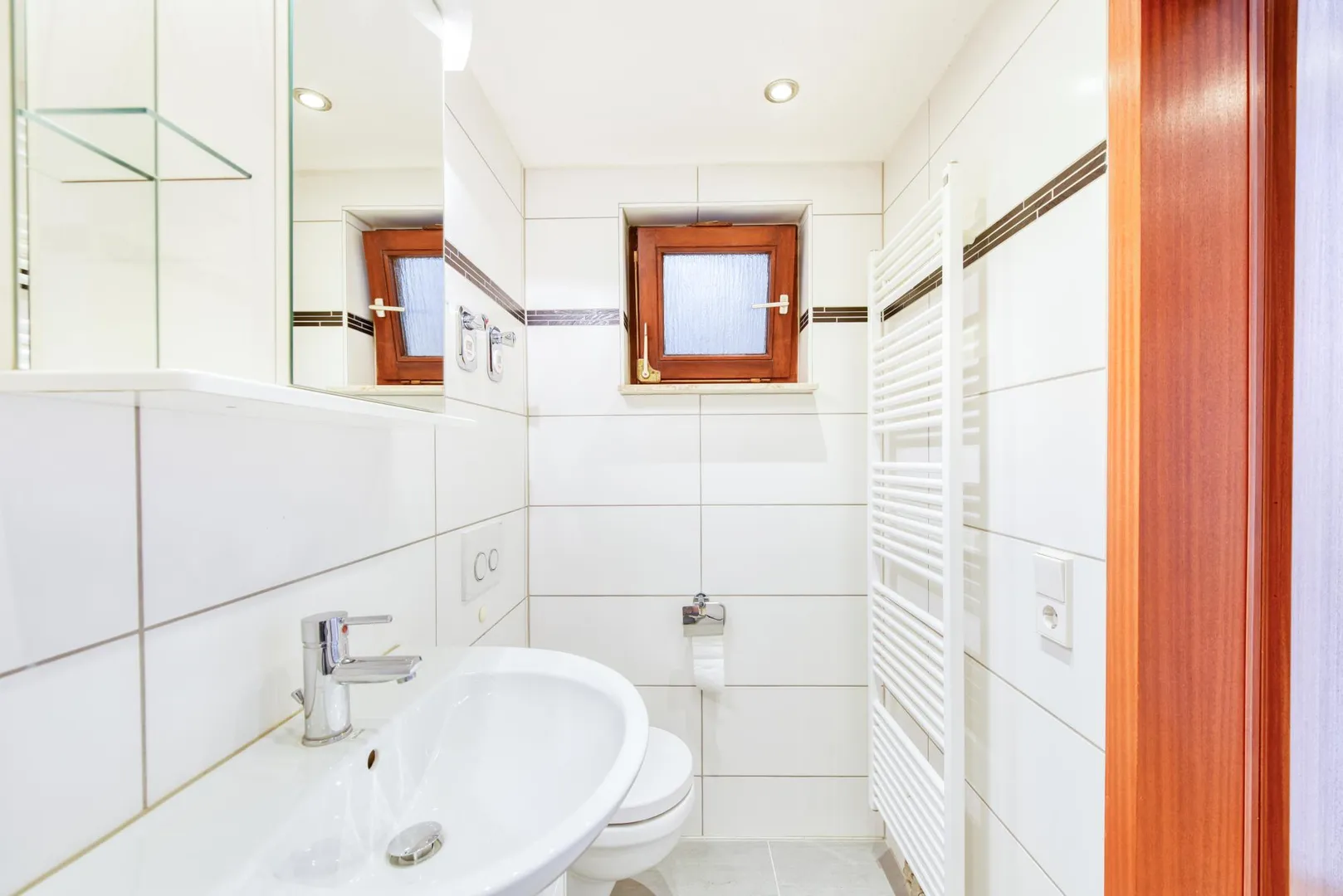 Das raumhoch geflieste Badezimmer mit Fenster wurde vor einigen Jahren modernisiert. Es ist ausgestattet mit Fliesenboden, bodentiefer Dusche, Handtuch-Heizkörper, WC, Waschbecken, belichtetem Spiegelschrank, Waschtisch-Unterschrank sowie abgehängter Decke mit Halogenlampen.