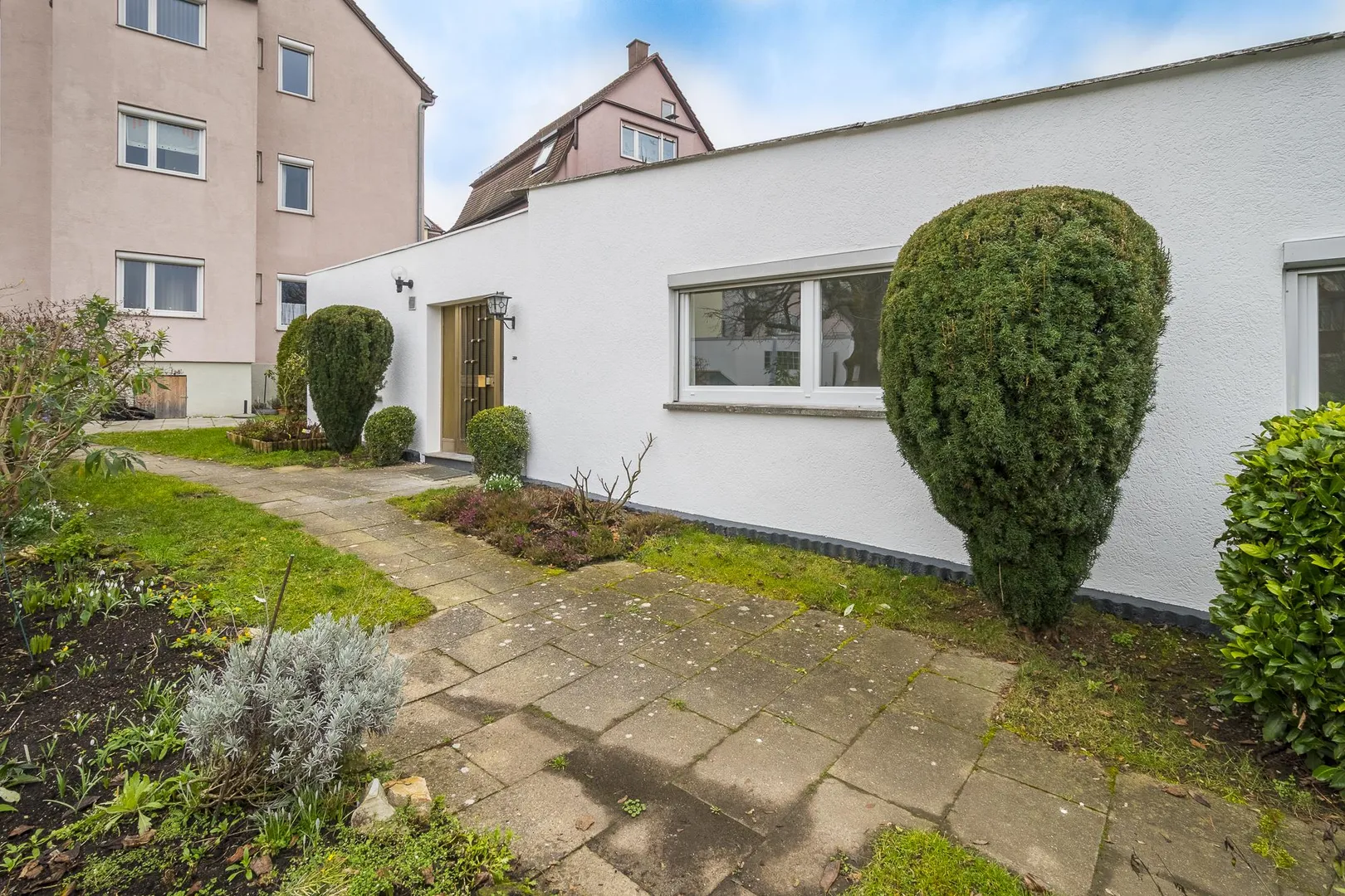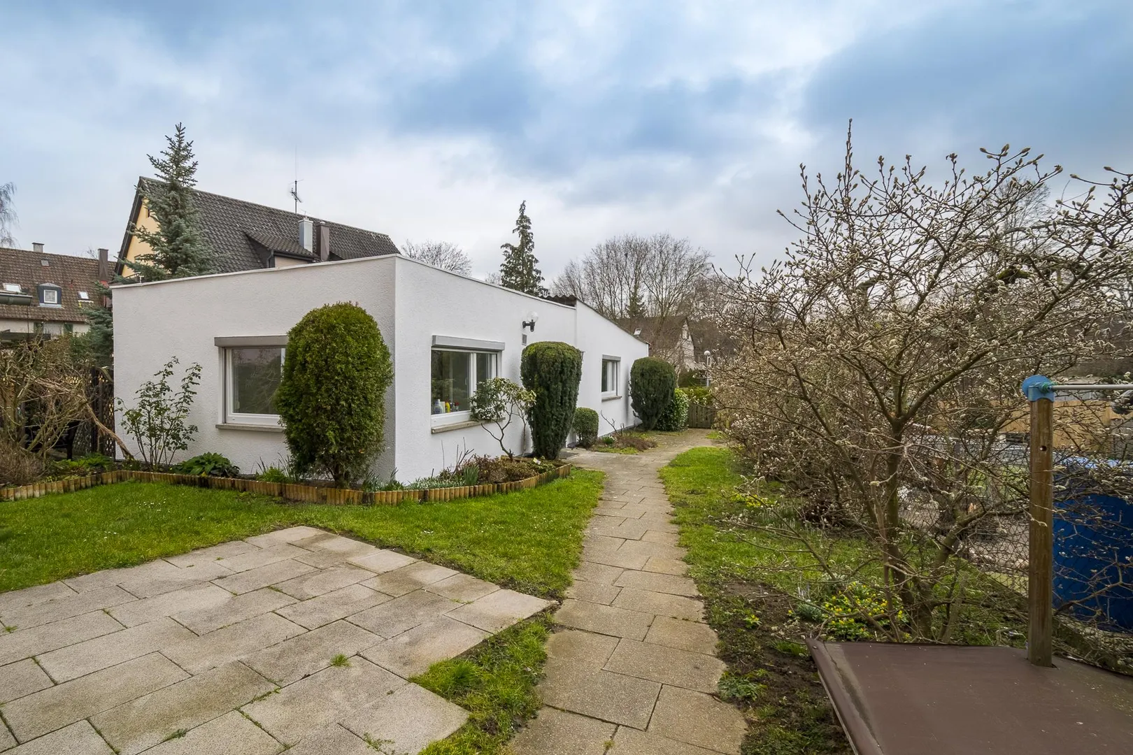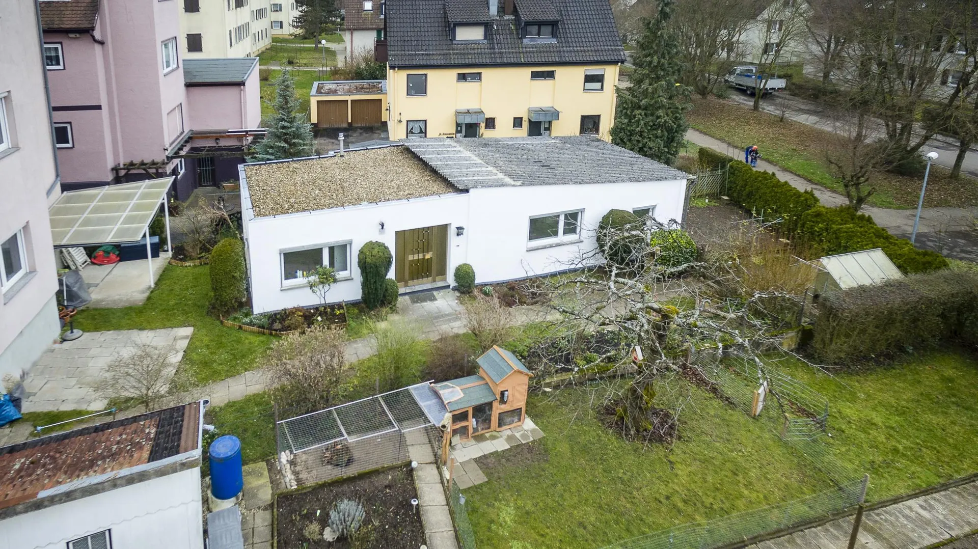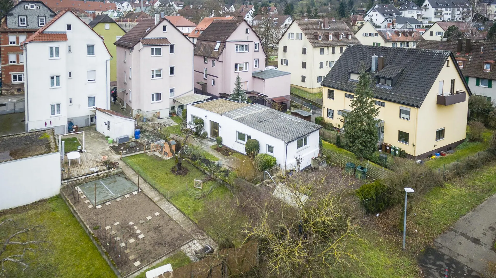 Dieser kleine, freistehende Bungalow wurde ca. 1954, massiv, ohne Unterkellerung, eingeschossig sowie mit Flach- und Pultdach erstellt.