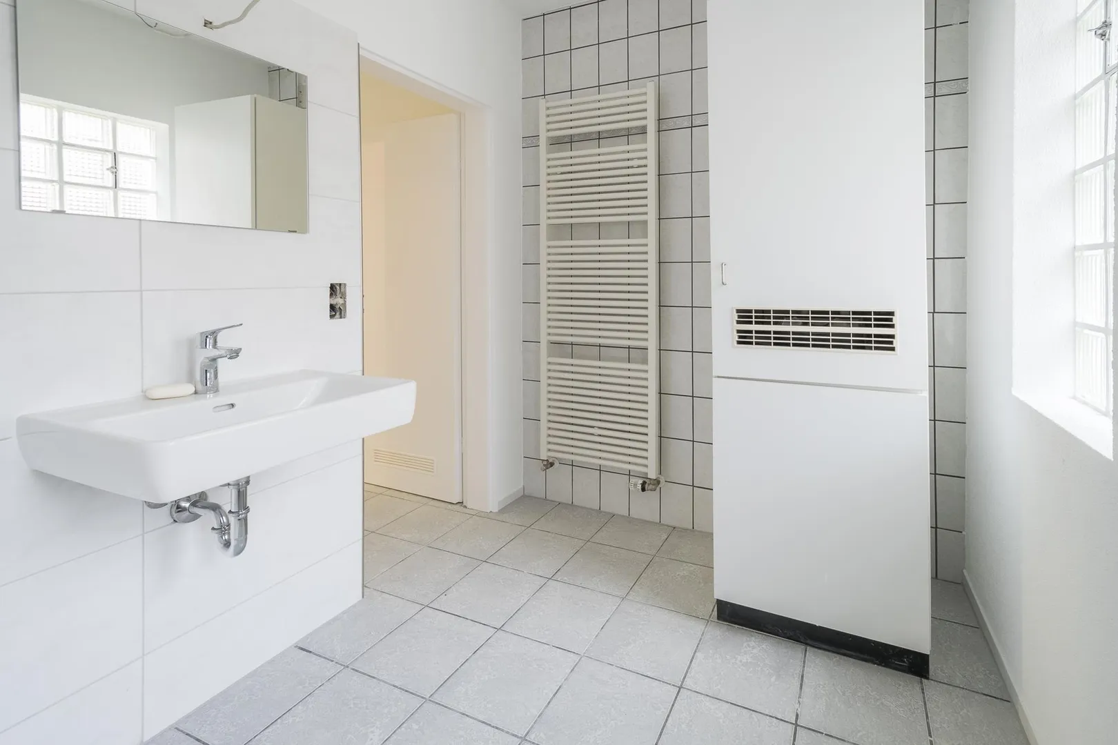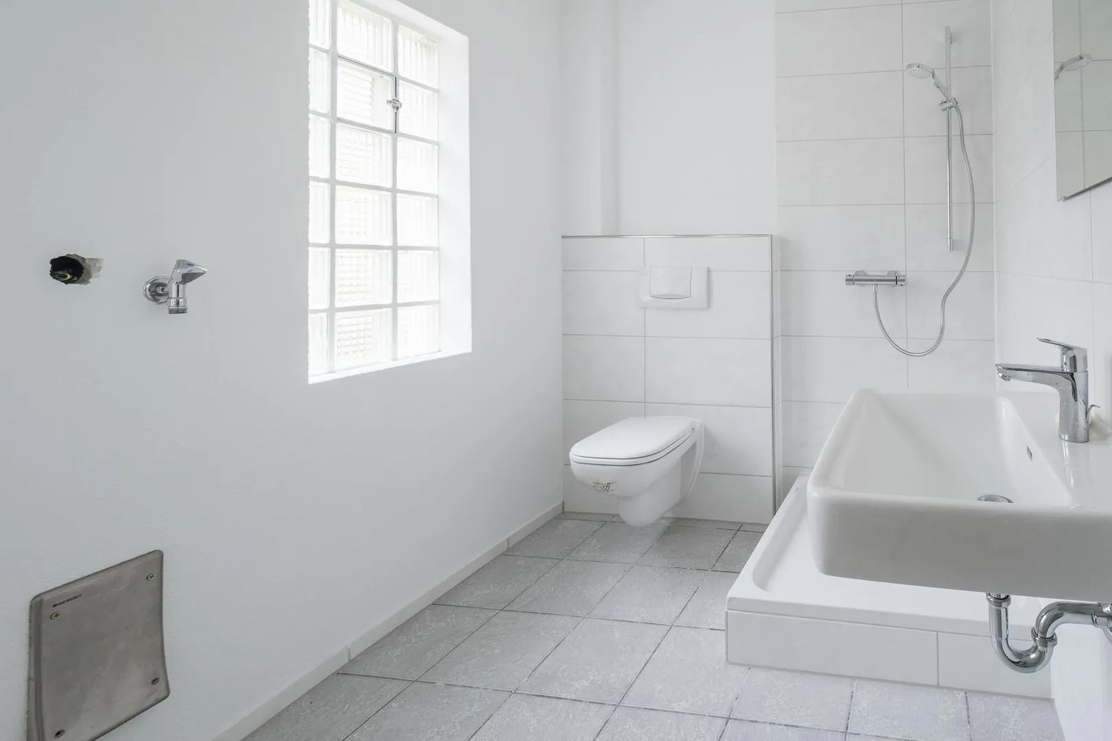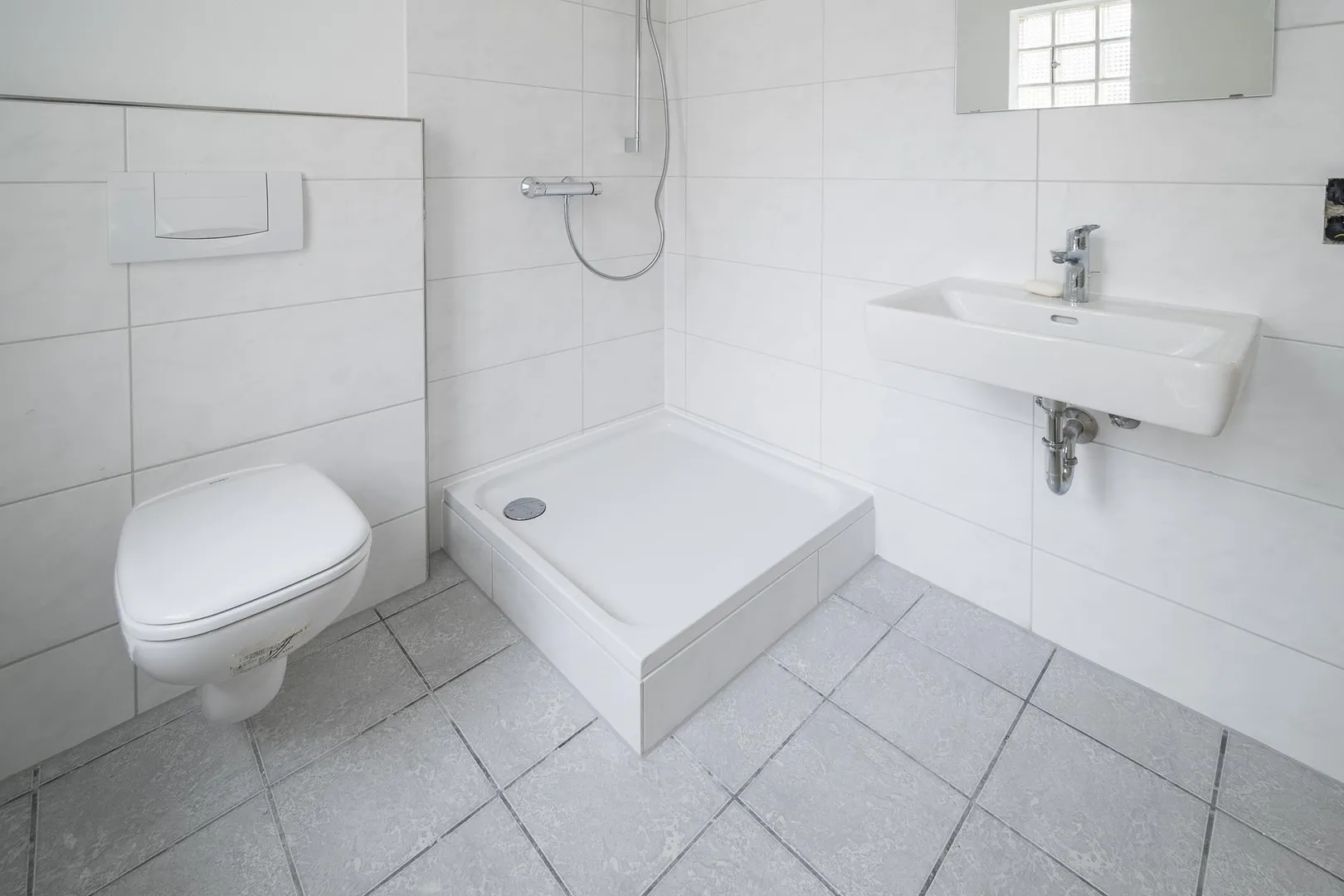 Aktuell wurde das Badezimmer modernisiert. Es ist ausgestattet mit einem Fliesenboden, einer Dusche, einem WC, einem Waschmaschinen-Anschluss, einem Handtuch-Heizkörper sowie einem Spiegel.