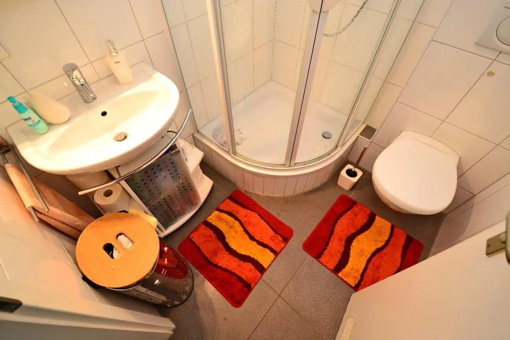 Das raumhoch geflieste Badezimmer ist ausgestattet mit einer Dusche, einem Handtuchheizkörper, einem WC sowie einem Spiegelschrank.