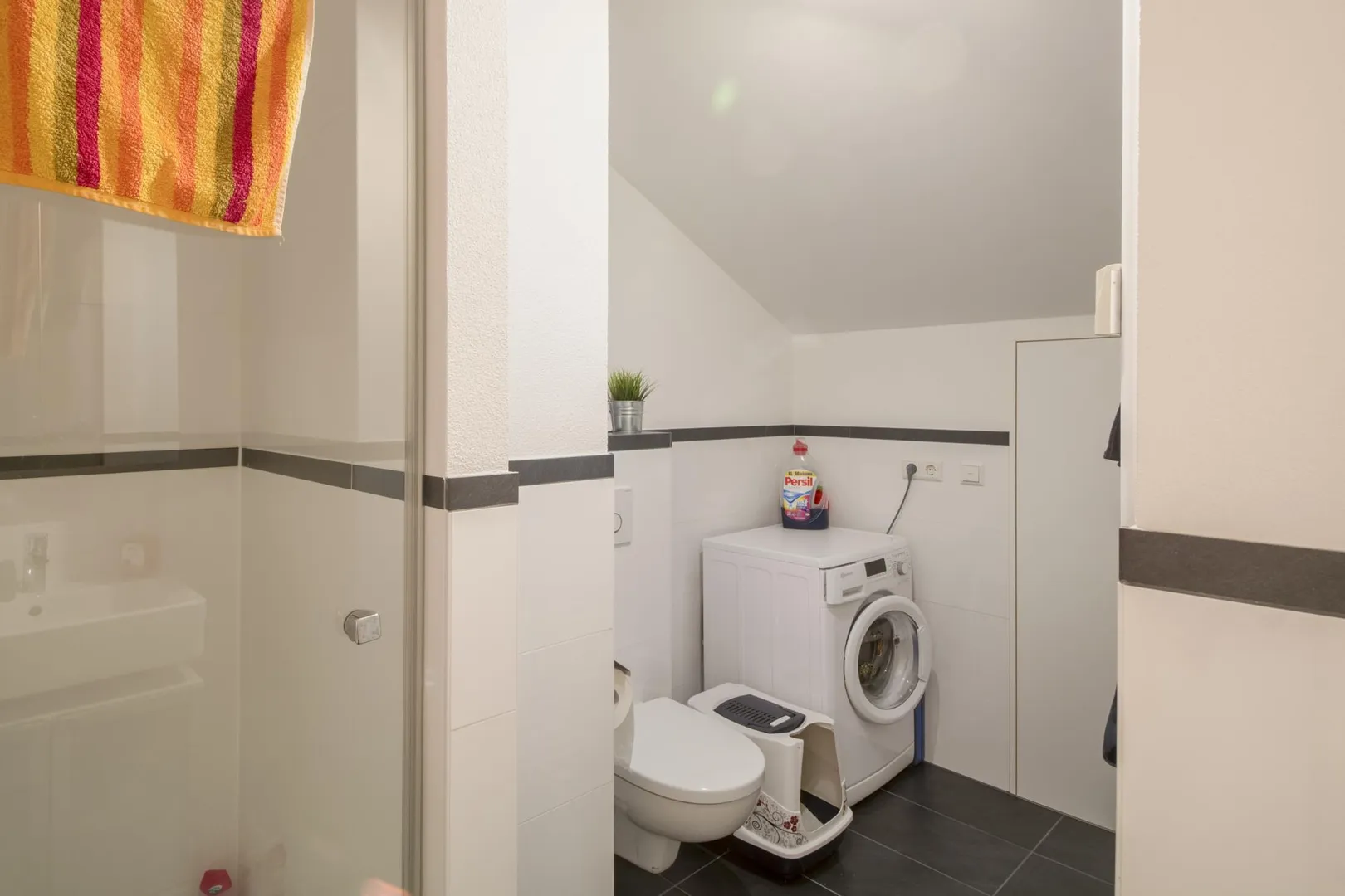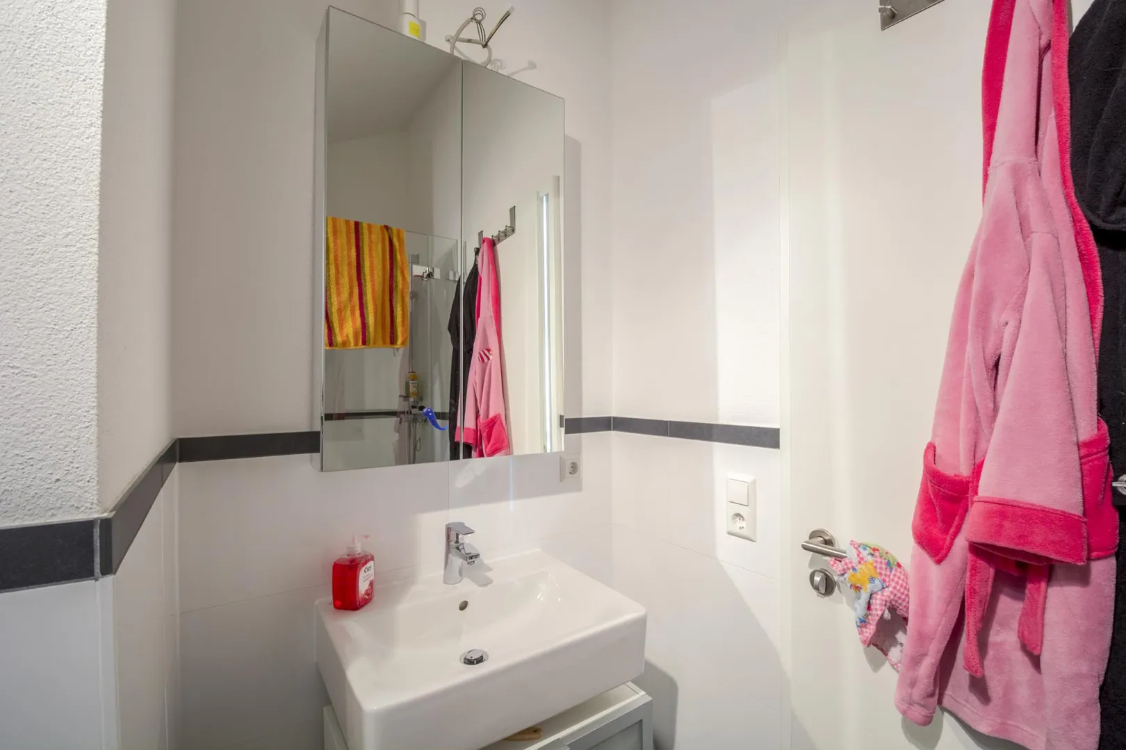 Das halbhoch geflieste Badezimmer ist ausgestattet mit einer Dusche, einem WC, einem Handtuch-Heizkörper und einem Waschmaschinenanschluss. Der Spiegelschrank kann vom aktuellen Mieter für 150 EUR übernommen werden.